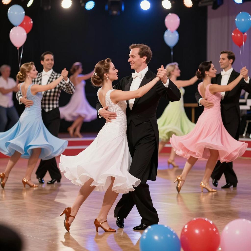 Dance scene, photograph. Central man in black tuxedo, white shirt, bow tie, dancing with woman in white dress. Surrounding people in various pastel dresses, some in plaid shirts, dancing. Background with hanging colorful lights, balloons. Red, blue, pink balloons in foreground. 12 people in total, energetic, smiling. Shiny, reflective dance floor. Elevated platform in background.