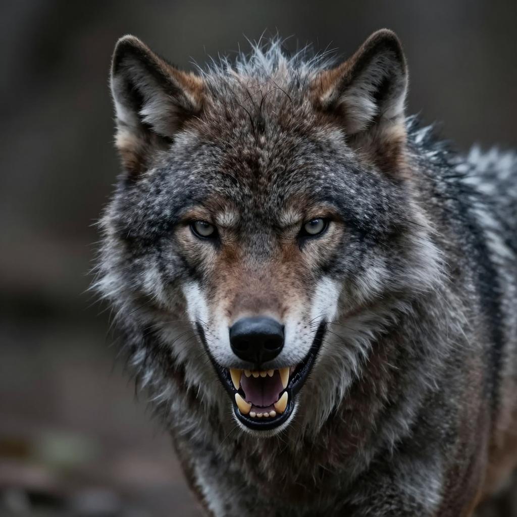 Close-up of a werewolf with long, wild, dark gray hair, fur-covered body, and intense expression. Mouth open, showing sharp, yellowed teeth. Dark, blurry background. Facial expression is snarling and aggressive. One visible eye, slightly squinted.