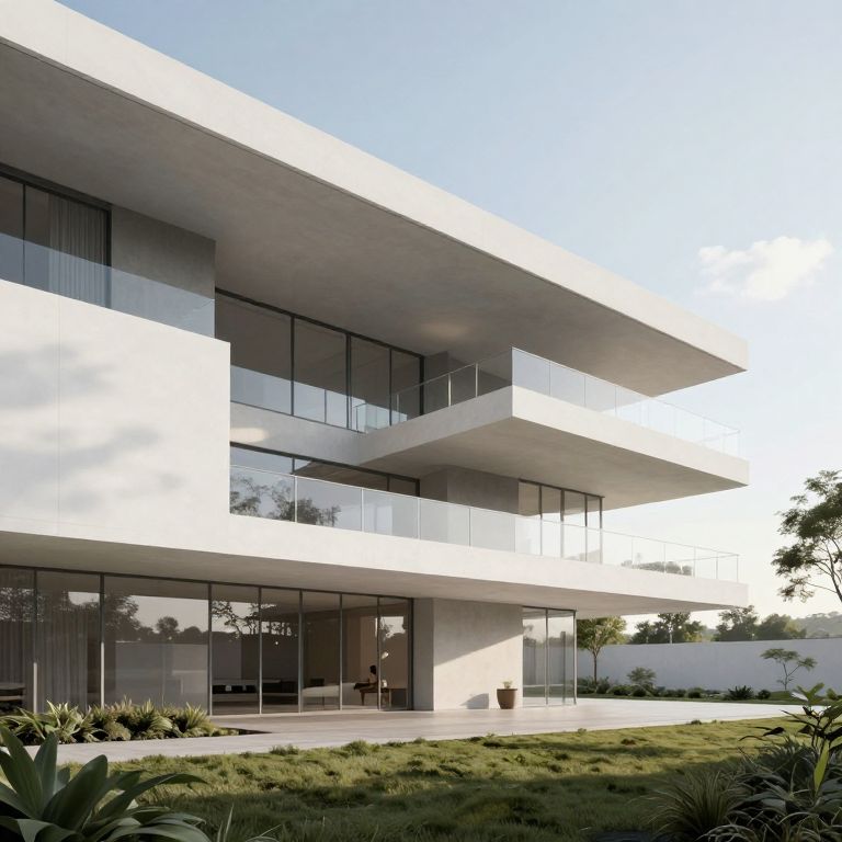 A modernist 3D-rendered architectural marvel features sleek, minimalist lines and expansive glass balconies, blending seamlessly with its serene outdoor setting, where the interplay of natural light and shadow creates a tranquil, almost dreamlike atmosphere that feels like it could dissolve into memory at any moment.