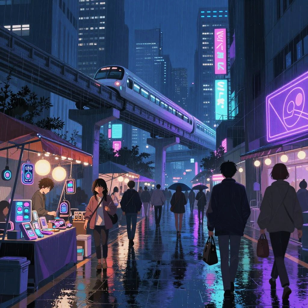 Anime city art depicting a rainy cityscape with intense neon colors reflecting off wet streets, crowded markets with vendors selling futuristic gadgets, high-speed monorails overhead, characters in stylish urban fashion, moody atmosphere with deep blues and purples.