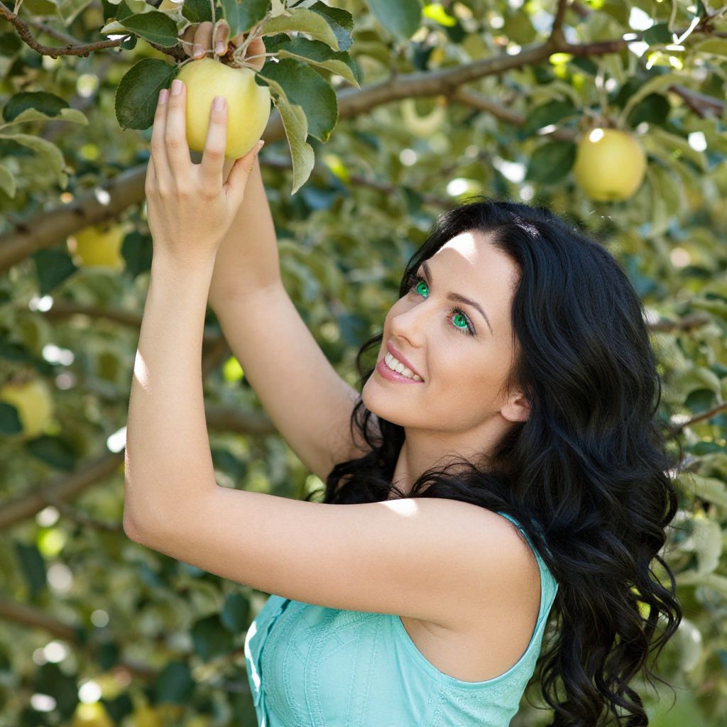 Photograph of a smiling woman with fair skin and long, wavy black hair, reaching up to pick a yellow apple from a tree. She's wearing a light blue sleeveless top and has bright green eyes. Sunlight filters through the green leaves, creating a dappled light effect. The background is filled with apple branches and leaves, adding a natural, vibrant feel to the image.