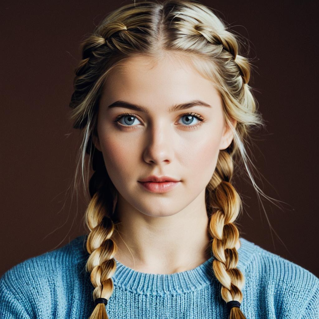 Woman dressy sweaters,1girl, solo, realistic, sweater, looking at viewer, photorealistic, blonde hair, blurry background, blurry, freckles, lips, brown hair, long hair, closed mouth