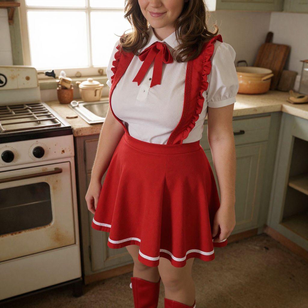 Close-up realistic shot of a woman in a full Heather Chandler costume standing in a dusty 1970s-style farmhouse kitchen, wearing the signature red skirt, white blouse, and matching boots, her face slightly turned with a playful smirk, soft morning light streaming through a window with a vintage oven and chipped ceramic dishes.. The woman has big tits and cute face