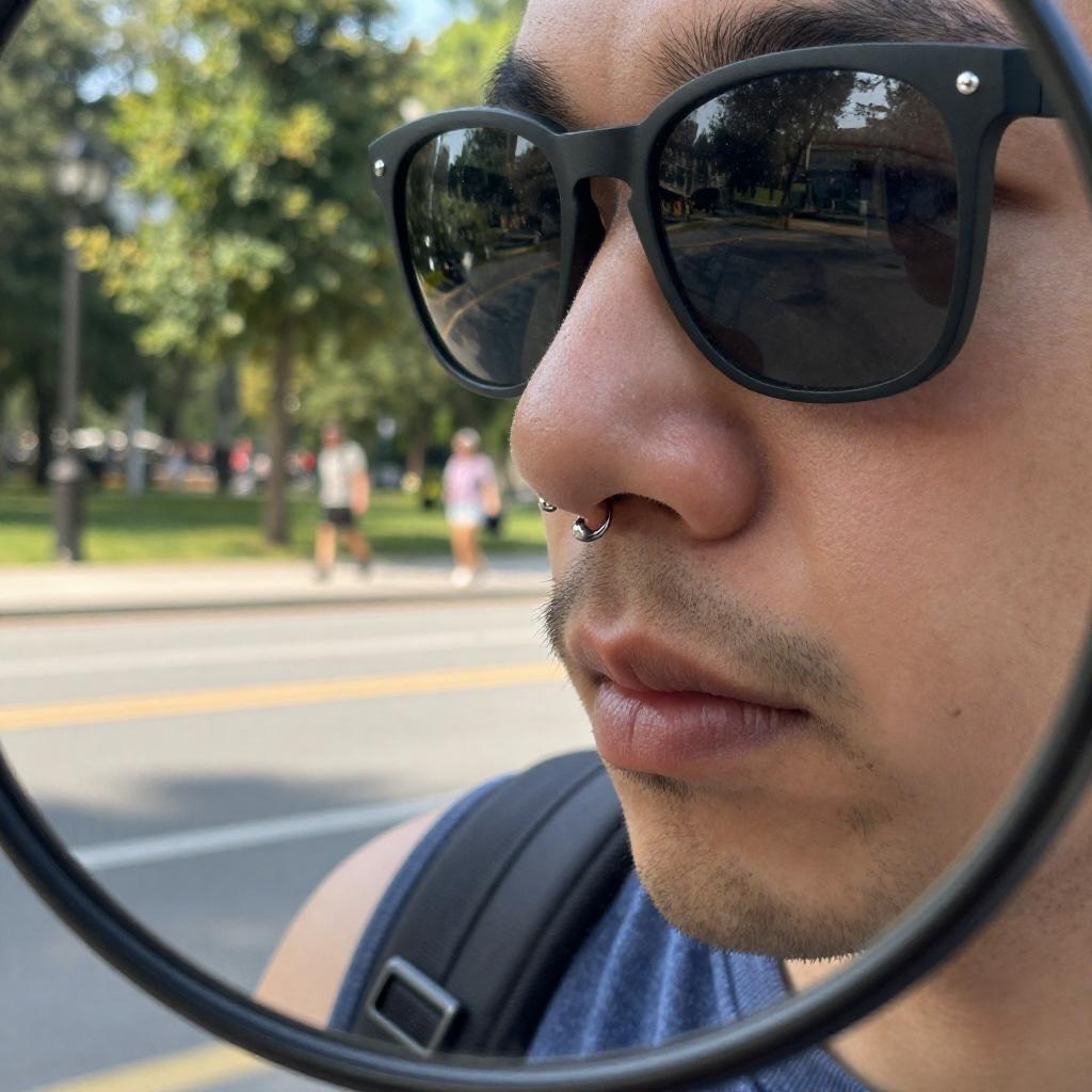 Close-up of a man's nose with a metal piercing, reflected in a mirror. He has a beard, sunglasses, and is wearing a blue sleeveless shirt. Background shows a sunny park with trees, a road, and blurred pedestrians.
