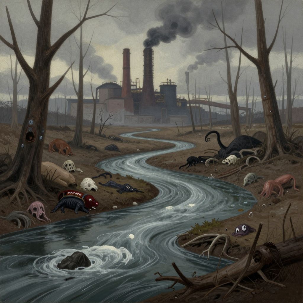 Corrupt ecosystem scene, polluted river flowing through a toxic wasteland, dead trees with hiding vermin, industrial factories spewing smoke in the background, wildlife suffering amidst human negligence, muted somber tones, painterly environmental dystopia illustration