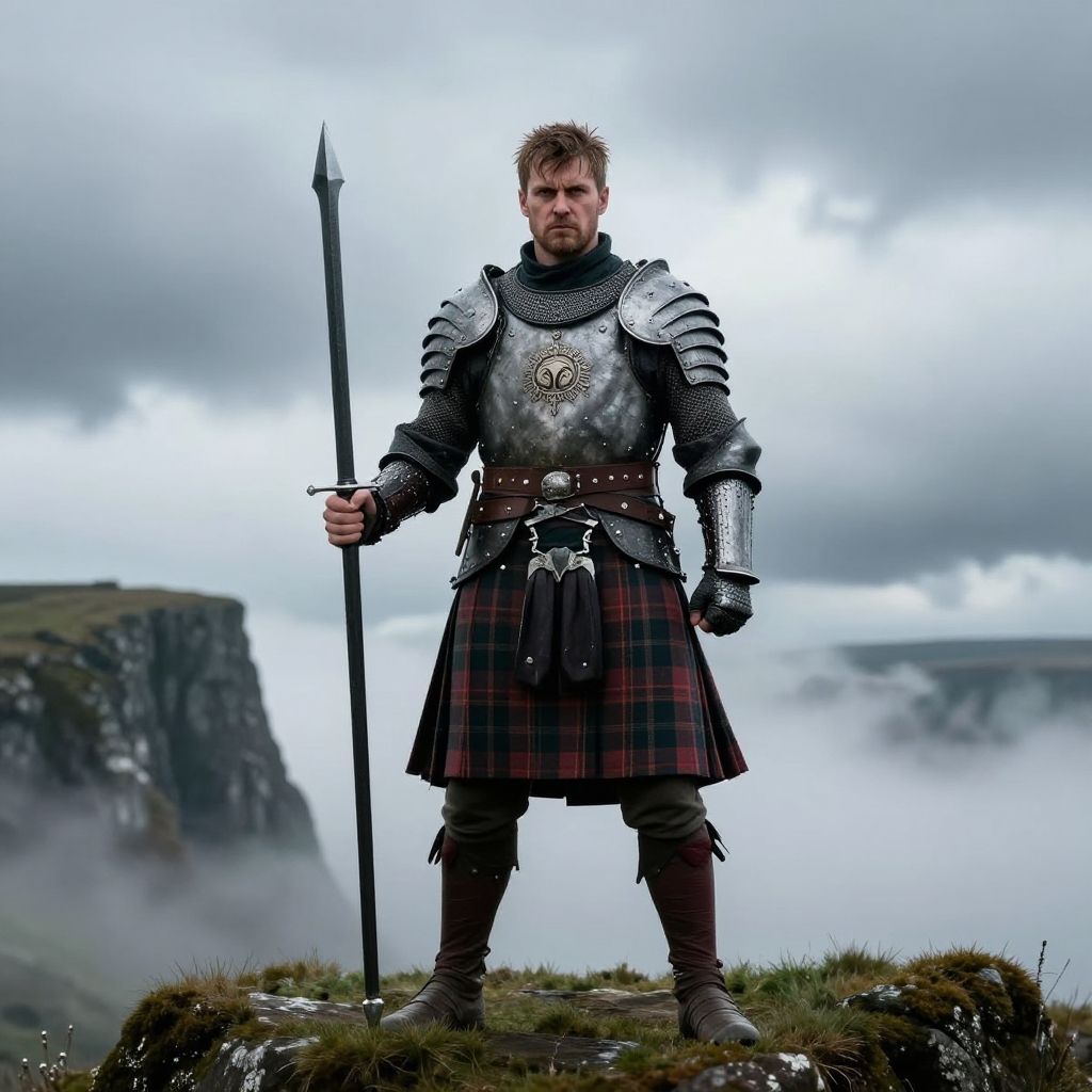 Scottish warrior standing proudly on a misty Highland cliff, wearing traditional tartan kilt and wielding a claymore, dramatic cloudy sky in the background, detailed armor and fierce expression