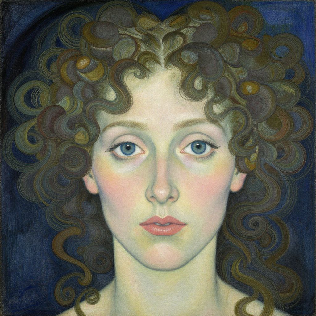 This is a digital painting of a young woman with fair skin and light blue eyes, set against a dark blue background. Her curly, brown hair, rendered with swirling, almost hypnotic patterns, frames her face. Her expression is neutral, with slightly parted pink lips. The painting style is reminiscent of Pre-Raphaelite art, characterized by its detailed, intricate hair and smooth facial features. The texture of the hair contrasts with the smoothness of her face, creating a visually striking effect. The overall color palette is muted, focusing on natural skin tones and dark hair.