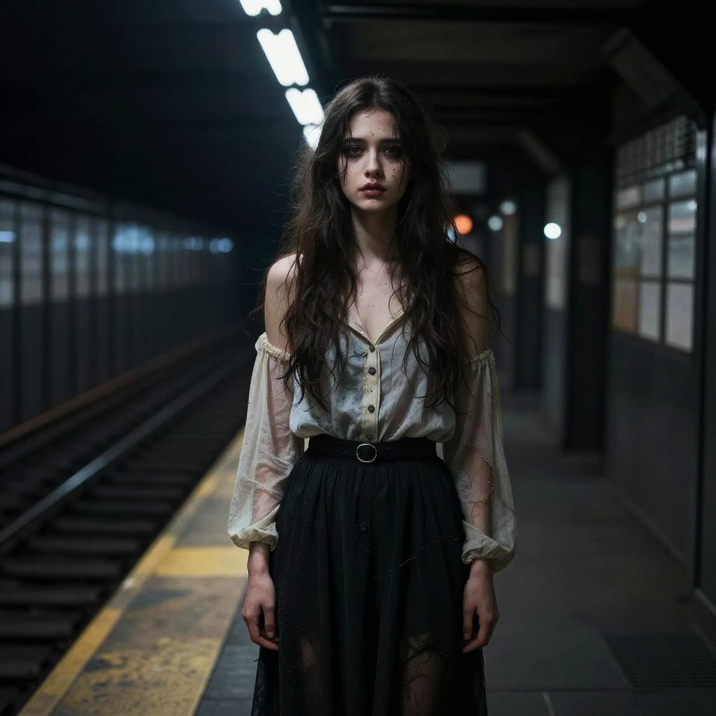 In a neon-lit subway platform, she stands alone, a melancholic ghost drifting through a harsh reality. Her stunning yet tattered elegance is a testament to a heart hardened by suffering, inspired by the works of Mark Brooks and Gerda Wegener.