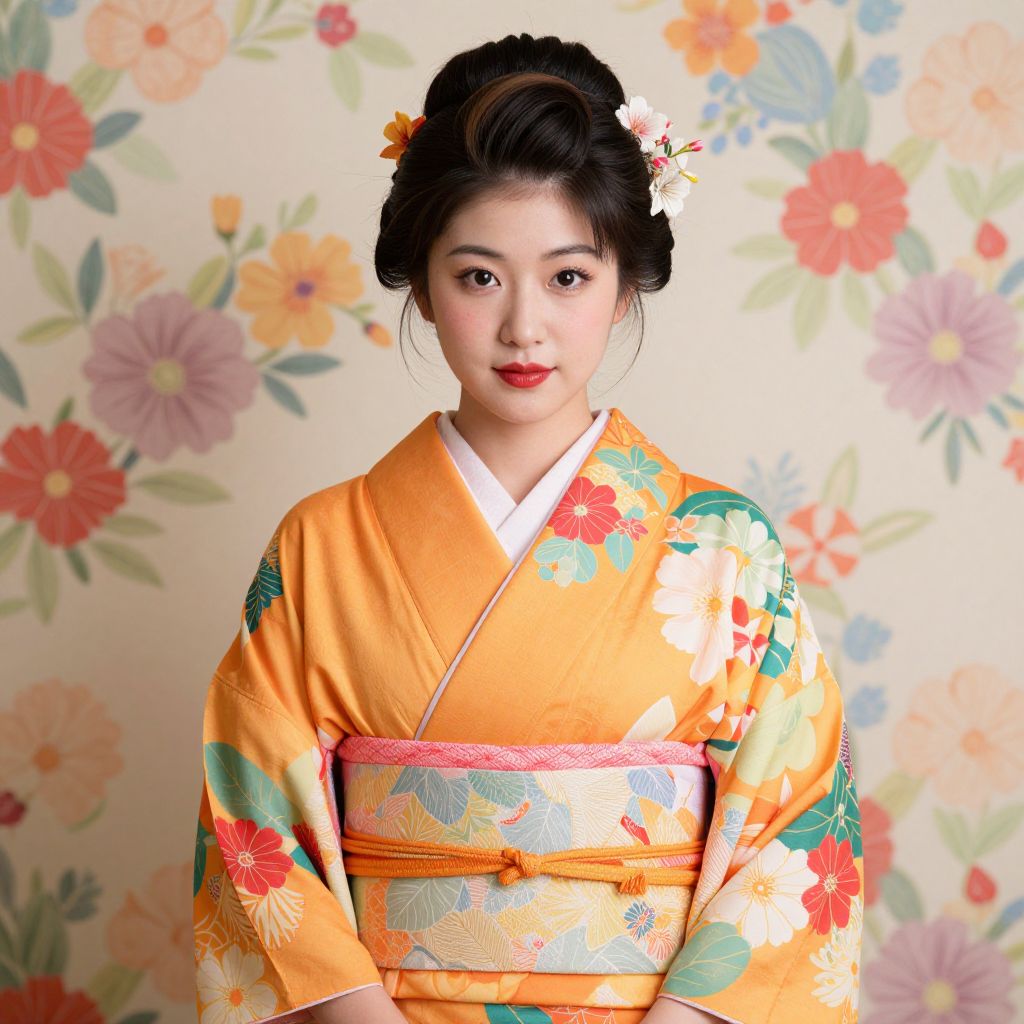 Photograph of an East Asian woman with fair skin, black hair styled in an elegant updo adorned with white flowers. She is wearing a vibrant orange kimono with red, green, and white floral patterns, and a pink and white obi sash. Her red lipstick contrasts with her calm expression. The background features a floral wallpaper with large, colorful flowers in shades of pink, orange, and purple. The image has a soft, warm light, highlighting the textures of the kimono fabric and the floral patterns.
