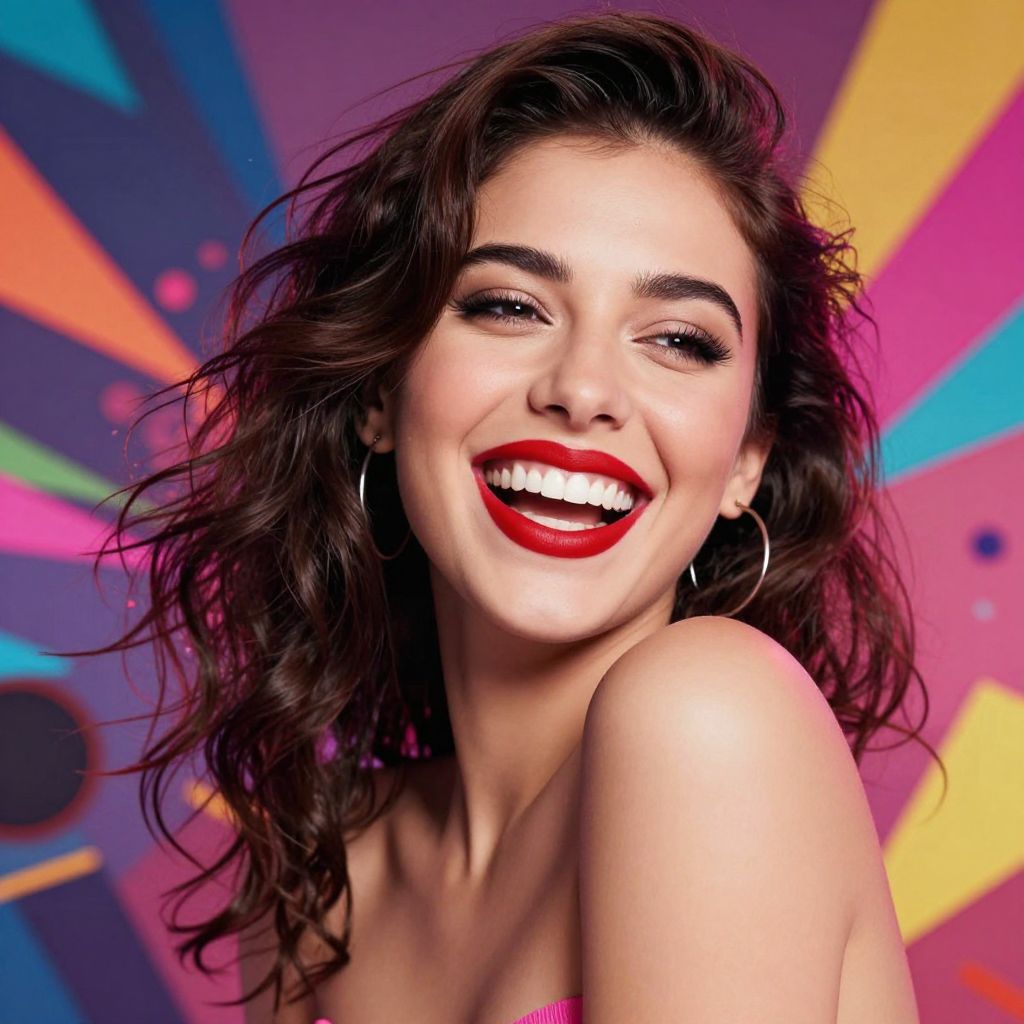 Photograph of a smiling woman with wavy, dark brown hair and fair skin. She has bold, red lipstick and wears large, silver hoop earrings. Her bright white teeth contrast sharply with her red lips. The background is vibrant, featuring a colorful, abstract pattern with neon pink, yellow, blue, and purple rays and dots. She is slightly turned to her left, showcasing her bare shoulder. The image has a high-contrast, modern, and energetic feel, emphasizing her cheerful expression and stylish appearance.