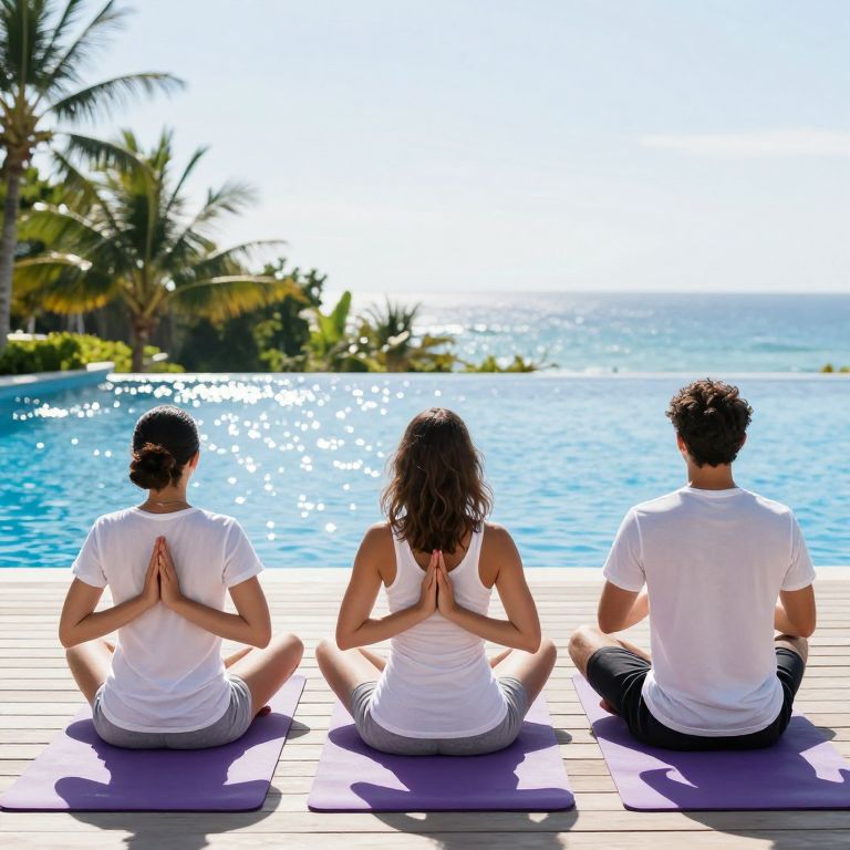 Photograph of three people, two women and one man, sitting in a meditative lotus position on purple yoga mats by a sunlit, infinity pool overlooking a bright blue ocean. They face away from the camera, wearing white T-shirts and shorts, with hands in prayer position. The background includes lush, green palm trees and a clear, sunny sky. The wooden deck they sit on contrasts with the vivid blue water and ocean horizon. The image exudes a serene, tropical, and peaceful atmosphere.