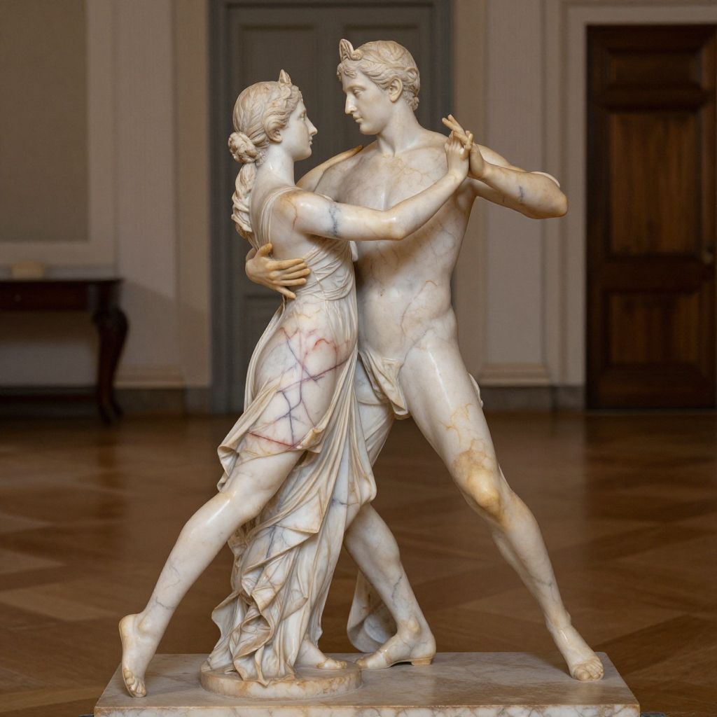 A masterful photograph of two dancing marble statues, colored veins in marble, couple dances a valse, elegant ballroom, wooden floor, intricate detail, perfectly shaped faces, photorealistic, masterpiece, nikon, depth of field