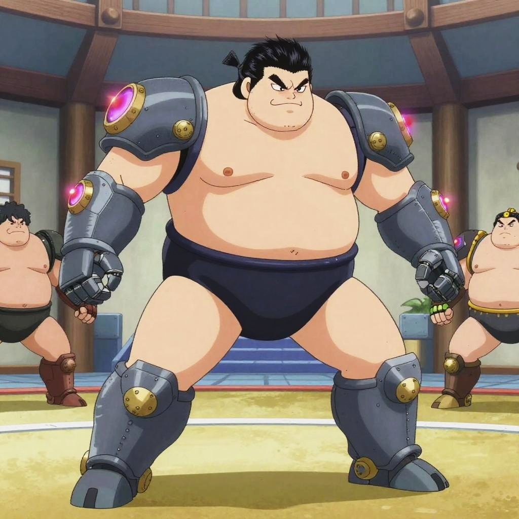 A battle robot sumo wrestler, wearing bulky mechanized armor with neon energy cores, engaged in charging aggressively in a sumo ring, set in a futuristic dojo, illustrated in the humorous yet action-packed anime style of Hideaki Sorachi.
