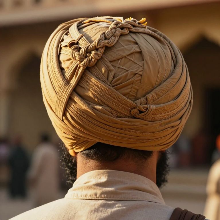A richly detailed close-up of a traditional turban wrapped with intricate knotting patterns, worn by a skilled Sikh warrior in a sunlit courtyard, golden light casting soft shadows, realistic texture, high resolution, cinematic lighting.