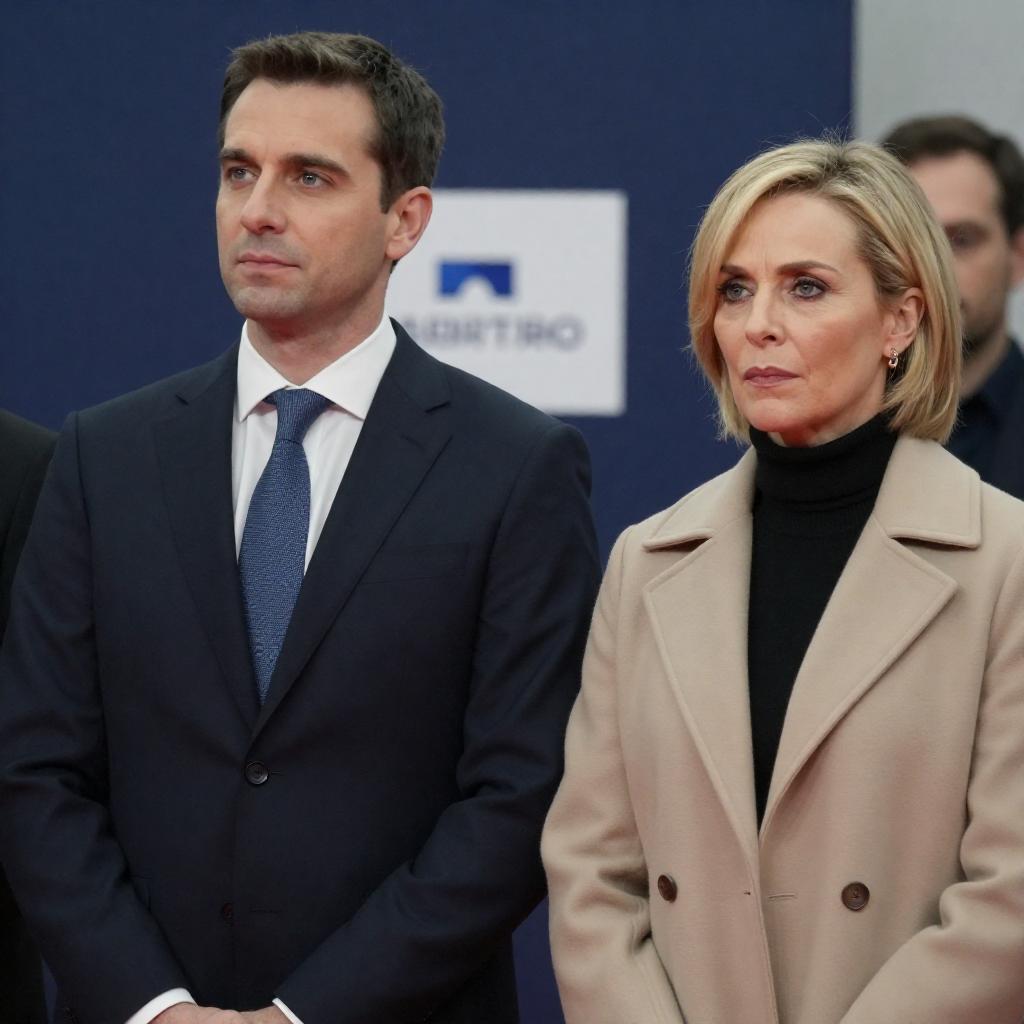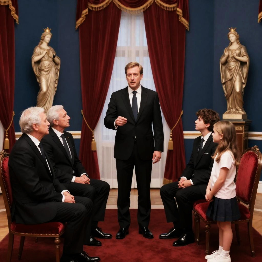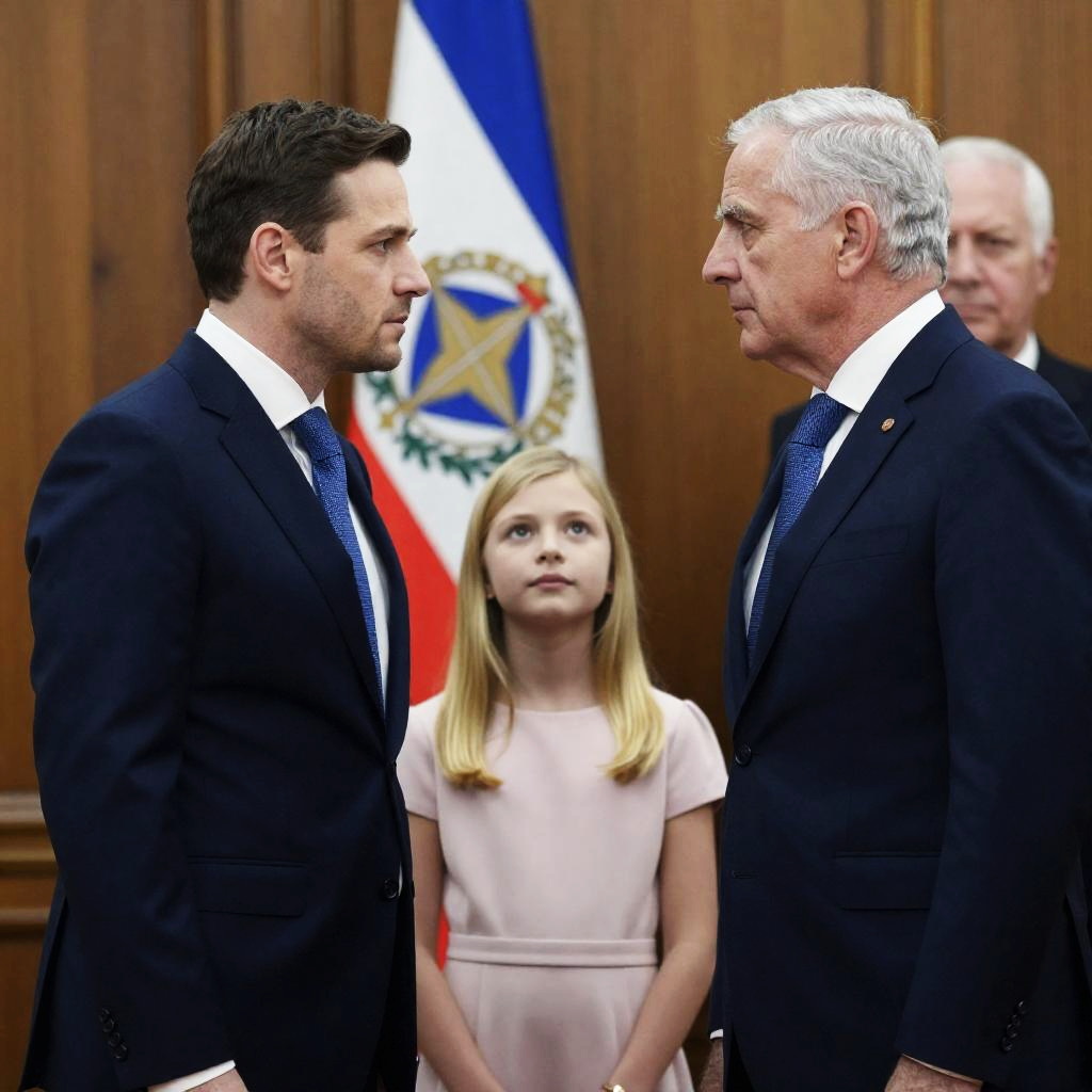 Photograph of two men in suits facing each other, with a blonde girl in a pink dress between them. Background has a wooden wall, flag, and older man in a suit. The men have intense expressions, the girl looks up.