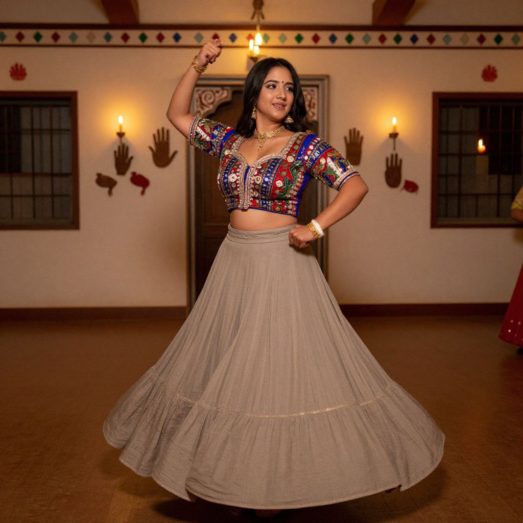 Photograph of a South Asian woman with medium brown skin and dark brown hair, dancing in a warmly lit room. She wears a colorful, cropped, patterned top with short sleeves and a high-waisted, grey, pleated skirt that flares out. She has a confident smile and is raising her right arm. The background features cream-colored walls with red handprints, two lit wall sconces, and a door with decorative designs. The floor is a dark, polished wood. The image has a vibrant, festive atmosphere.