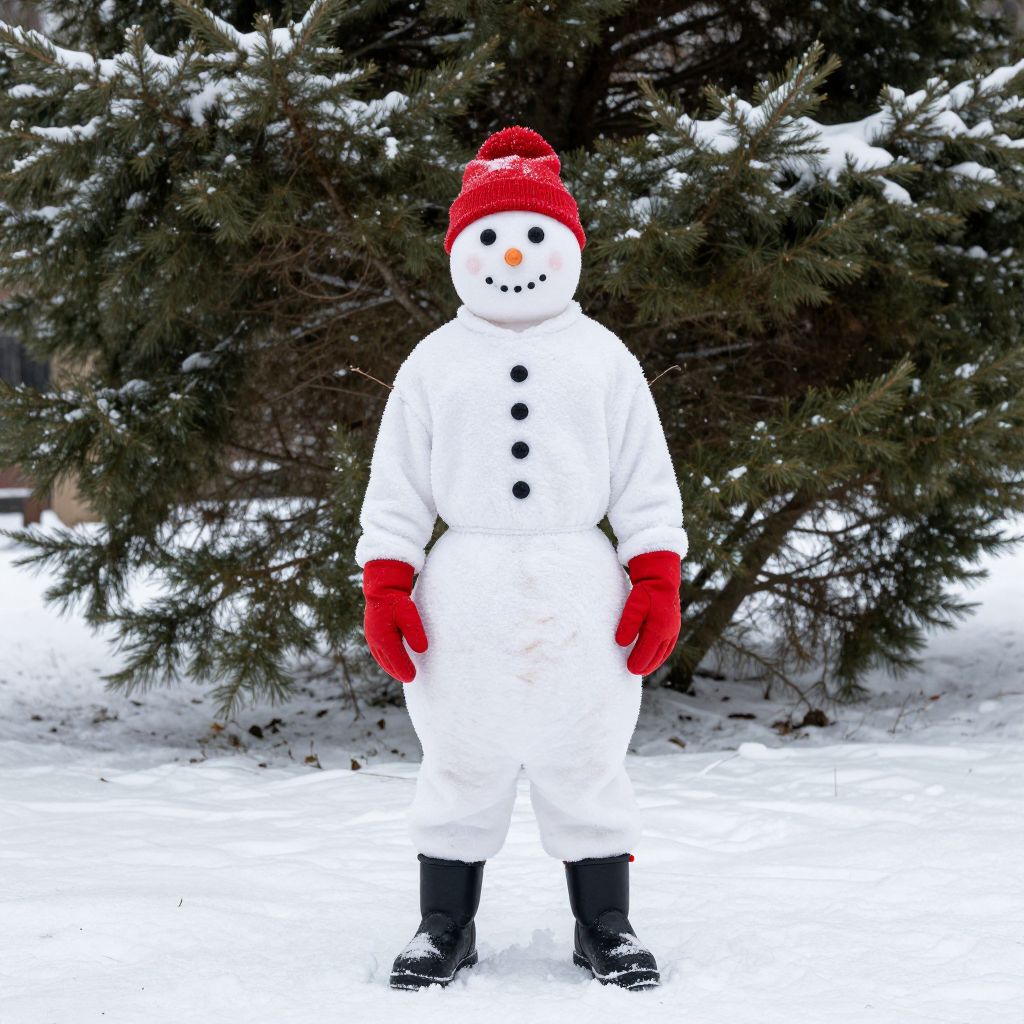Photograph of a snowman costume with red hat, gloves, and buttons, standing in snowy park against a snow-covered pine tree.