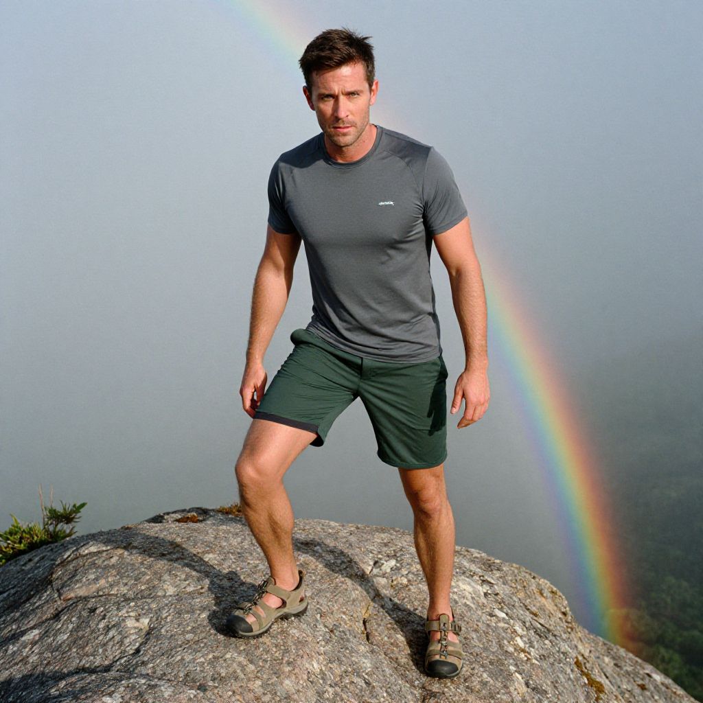 Photograph of a muscular, light-skinned man with short brown hair and a serious expression, standing on a rocky outcrop. He wears a gray, fitted, short-sleeve t-shirt, dark green athletic shorts, and gray hiking shoes. A vivid rainbow arcs across the misty, blue-gray sky in the background. The man's stance is wide-legged, with one knee slightly bent. The rocky surface is textured and rugged, with sparse greenery at the bottom left. The rainbow's colors are bright and distinct, adding a striking contrast to the muted tones of the man and the sky.