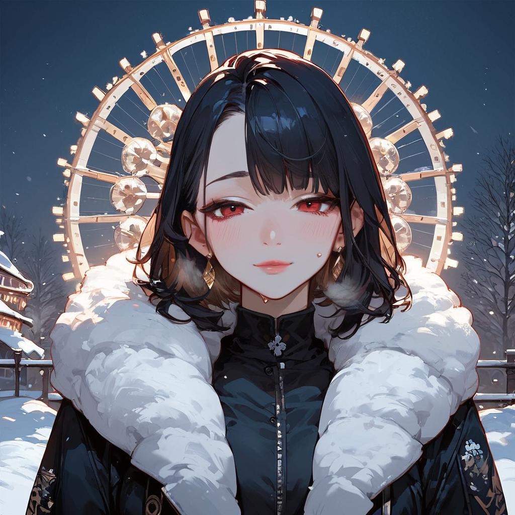 Digital artwork of an anime-style young woman with medium-length black hair and brown eyes standing outdoors at night in a snowy setting. She wears a black winter coat with a large white fur collar, and gold earrings. Behind her, a glowing ferris wheel and softly lit lampposts create a serene winter atmosphere.