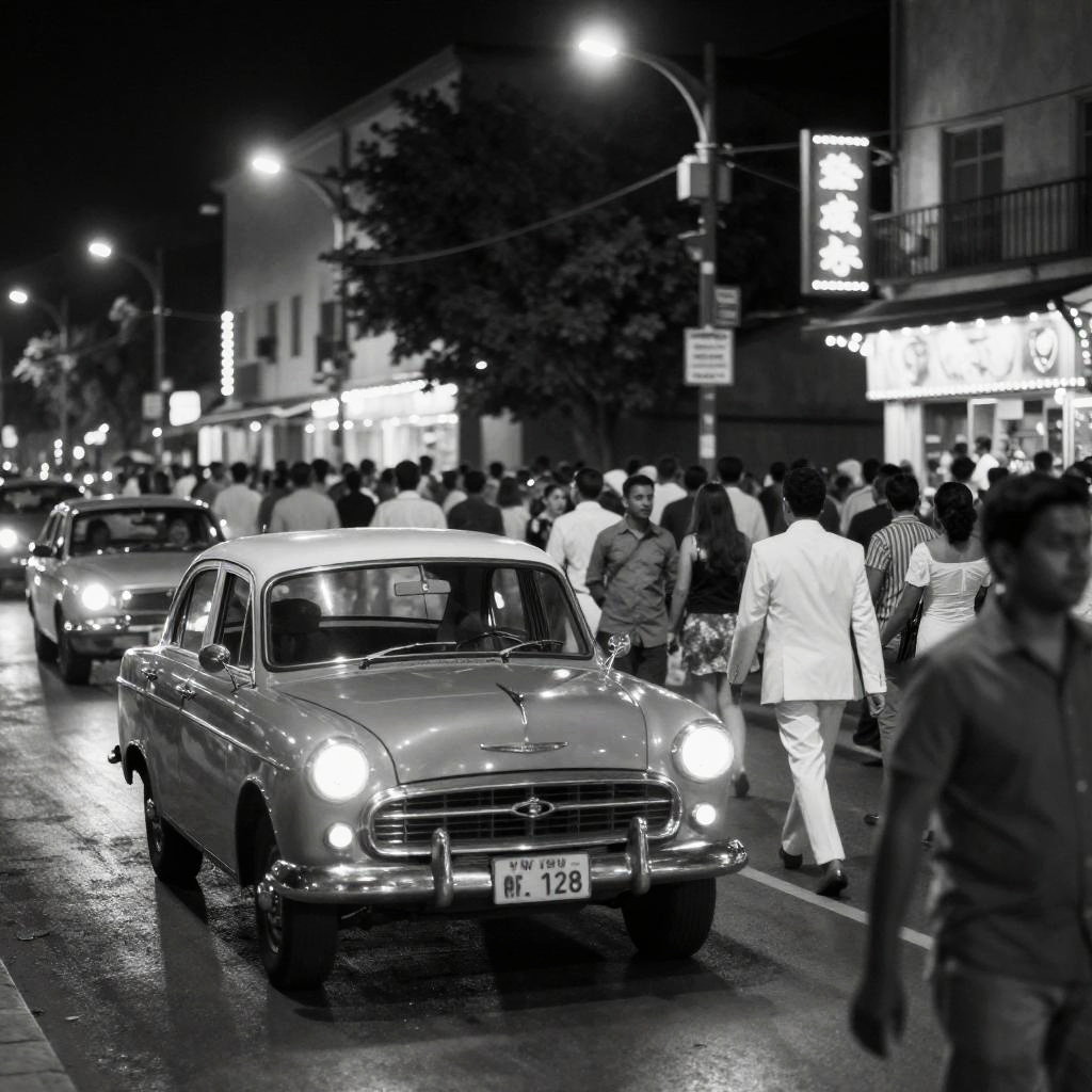 Black and white photograph of a bustling nighttime street scene. A vintage car with bright headlights is prominently in the foreground, driving through a crowded crowd. People in various outfits, including some in white suits, fill the street. Streetlights and illuminated signs create a sparkling backdrop. The crowd's movements and the car's headlights create a lively, energetic atmosphere.