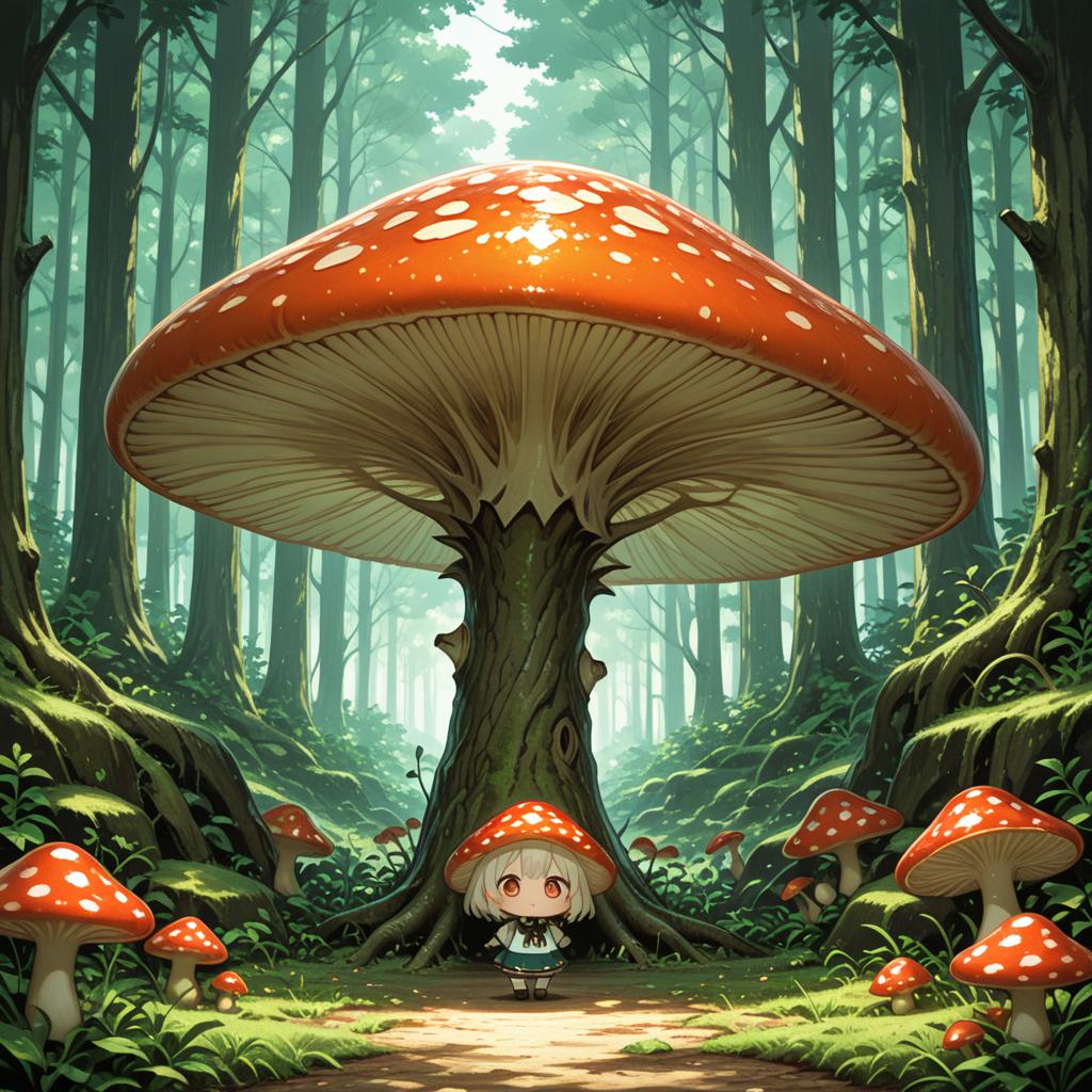 Mushrooms forest, 1girl, chibi illustration.media, masterpiece, best quality