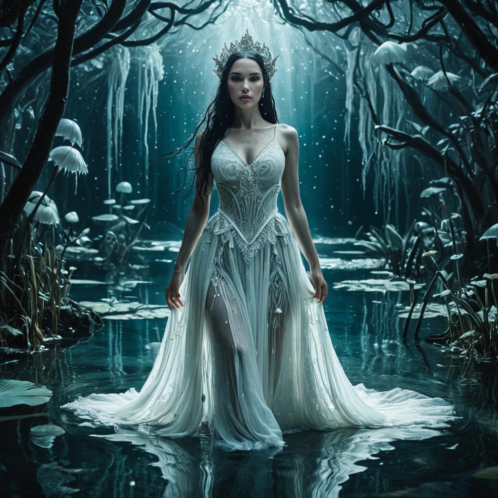 A mystical scene featuring a pale-skinned woman standing waist-deep in a dark, magical lagoon. She wears a detailed, transparent wet white dress and a decorative crown. Surrounding her are ethereal plants and glowing mushrooms, illuminated by soft, neon blue light filtering through dense forest branches. The atmosphere is dreamlike with mist and sparkling water effects, emphasizing fantasy and water magic themes.