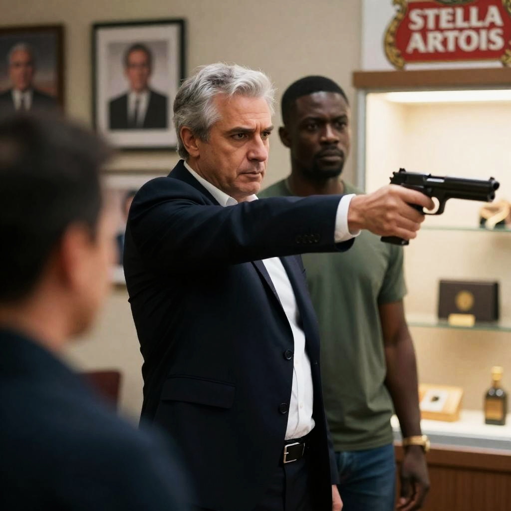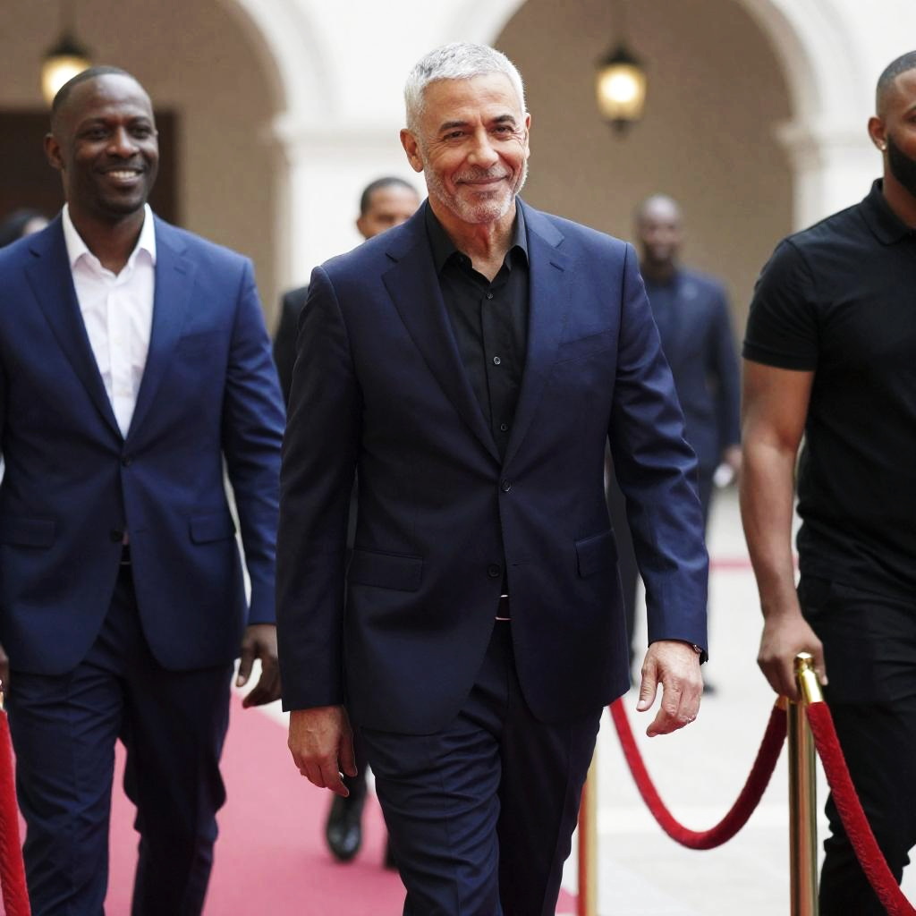 Photograph of a man with short gray hair, wearing a dark blue suit and black shirt, smiling while walking through a red rope barrier. To his left, a smiling Black man in a blue suit. To his right, a partially visible man in a black shirt. Background includes arches and soft lighting. Several people in the background.