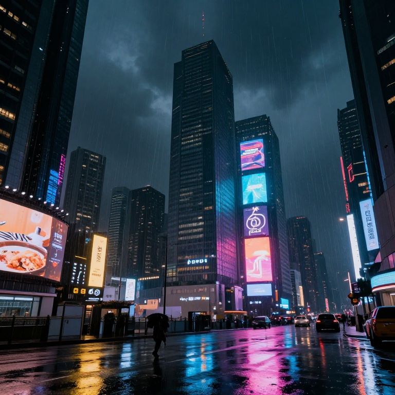 Photograph of a rainy night in a bustling urban city, featuring tall, dark skyscrapers with brightly illuminated billboards. Neon lights in pink, blue, and white reflect off the wet, shiny pavement. A few pedestrians are silhouetted in the foreground. Buildings display various advertisements, including a prominent neon Coca-Cola sign and a glowing burger image. The sky is overcast with dark clouds. The overall scene is vibrant and futuristic, capturing the energetic atmosphere of a modern cityscape.