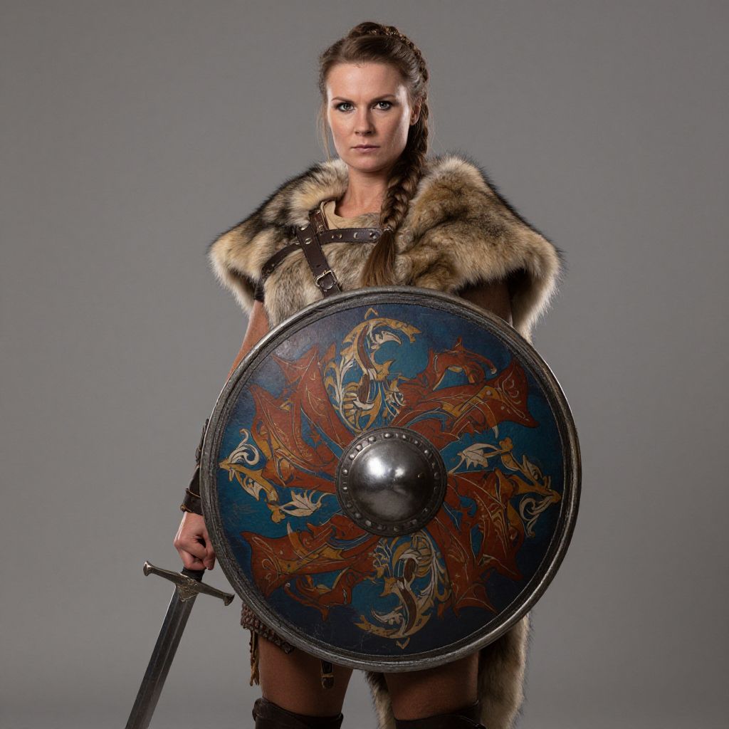 Photograph of a stern-faced woman with fair skin and brown hair in a braid, wearing a fur-lined, leather Viking-style tunic. She holds a large, round shield featuring a vibrant, ornate design of red and gold dragons on a blue background, with a metallic center. Her right hand grips the hilt of a straight sword, and she stands against a plain gray background. The image has a studio lighting setup, emphasizing her strong, warrior-like presence.