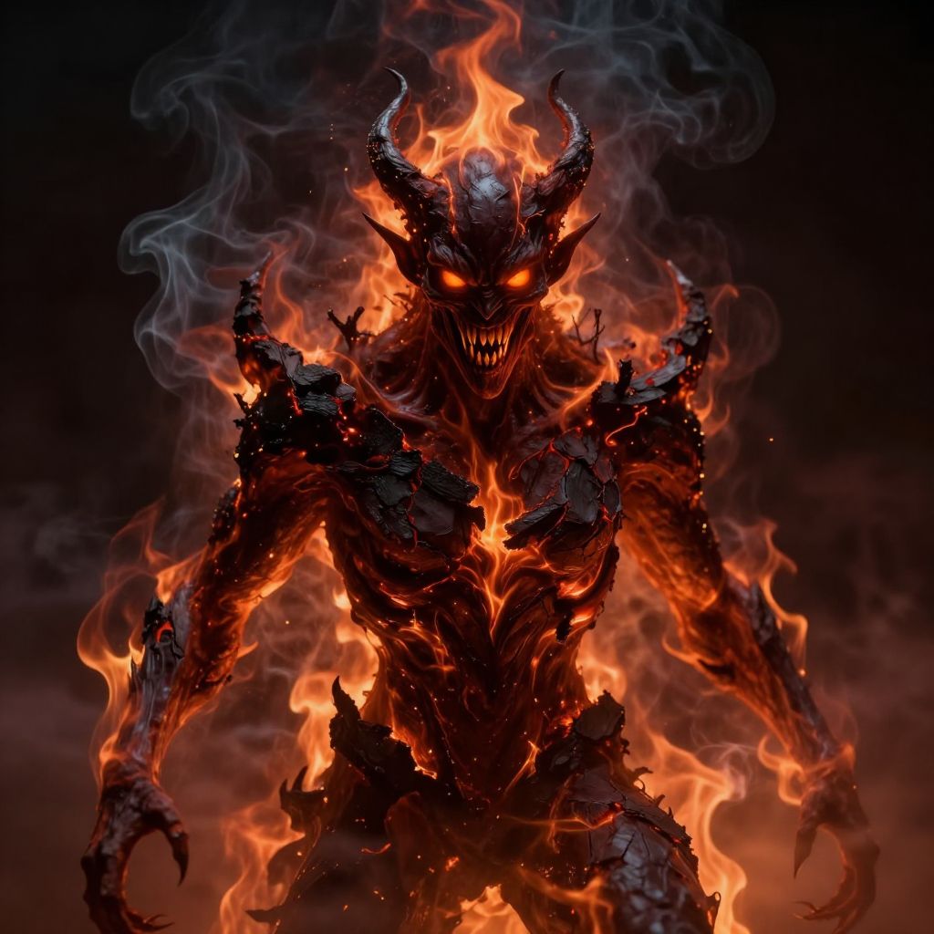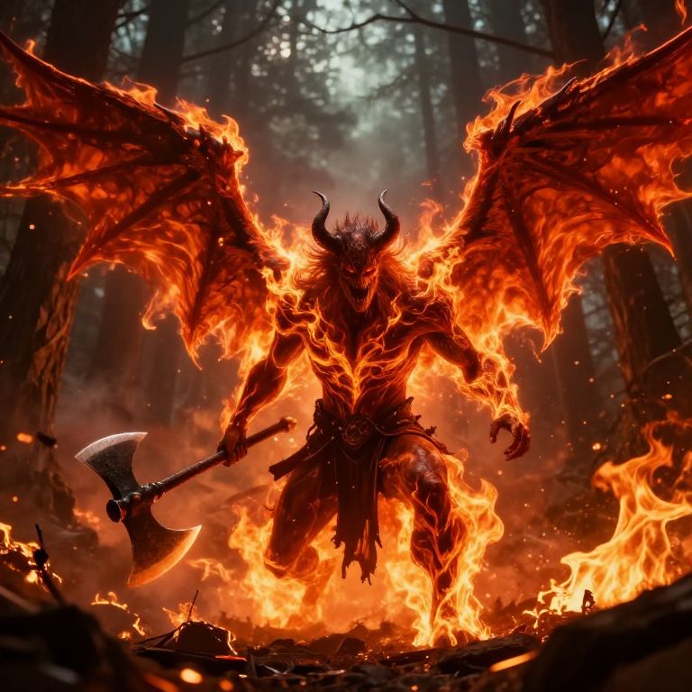 Demonic warrior charging through a burning forest, massive demonic wings spread wide, engulfed in hellfire, wielding a massive battle axe, chaotic apocalyptic background