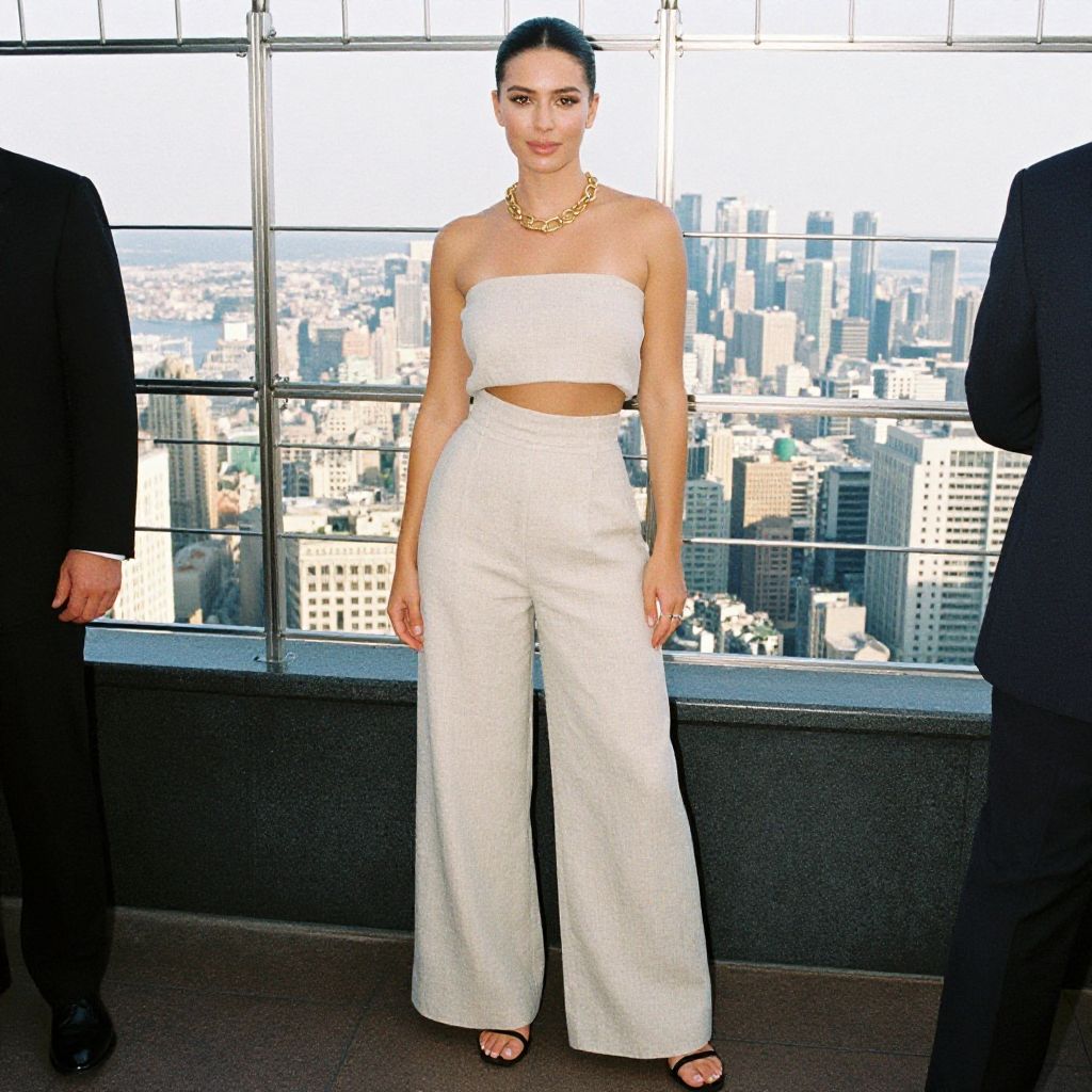 A woman, ib technicolor film stock, minimalist chic, strapless linen crop top, matching high-waisted wide-leg pants, natural beige tone, chunky gold chain necklace, strappy black flat sandals, understated makeup, sleek updo hairstyle, at a skyline observation deck event, enjoying the city view. Sexy. Pretty face and beаutiful eyes. Big breasts