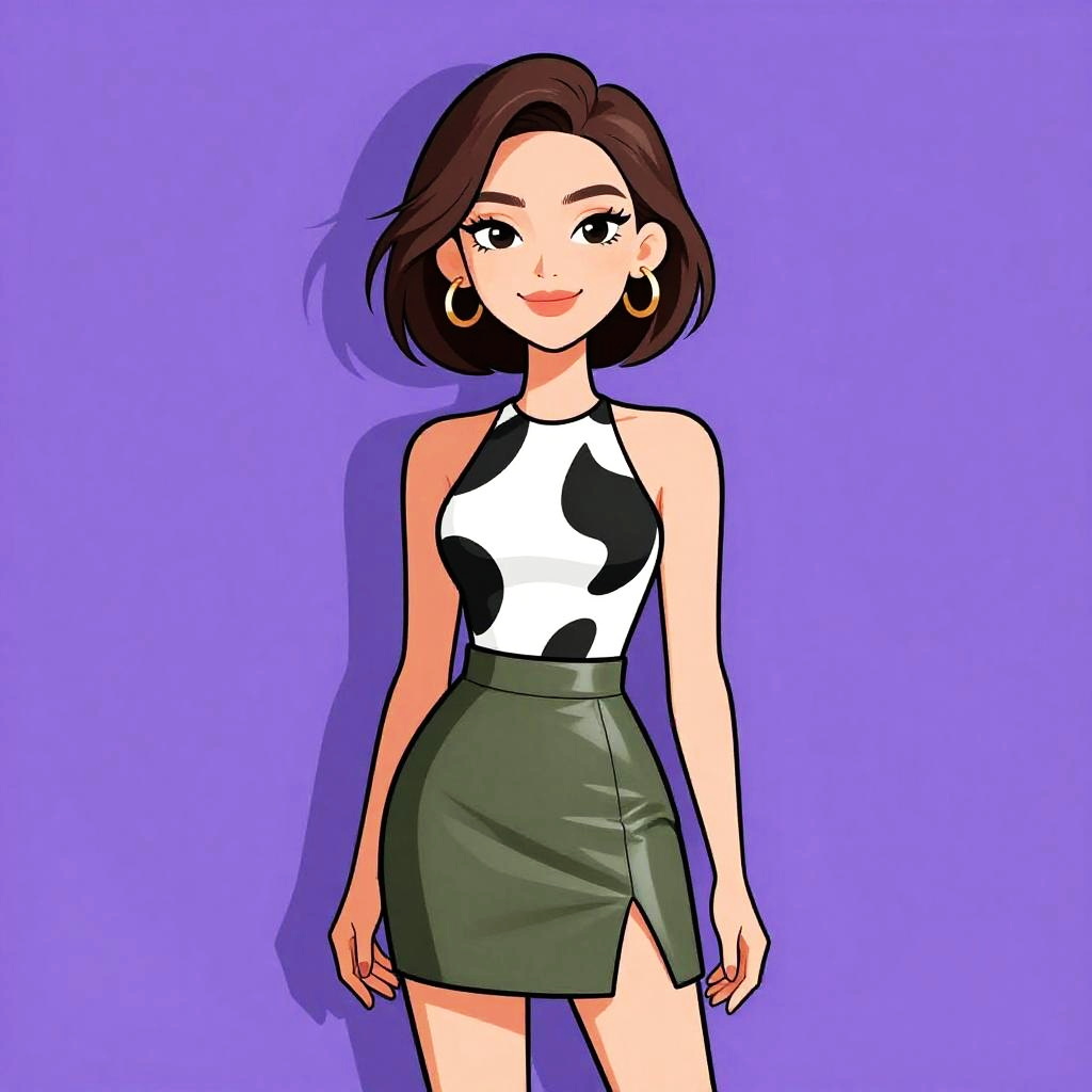 This is a digital illustration of a young woman with light skin and shoulder-length dark brown hair, styled in a slight wave. She has large, almond-shaped brown eyes, subtle eyeliner, and pink lipstick. She is wearing a sleeveless, white halter top with black cow-patterned designs, and a high-waisted, green leather mini-skirt with a slanted front slit. She accessorizes with large hoop earrings. The background is a solid, vibrant purple. The art style is reminiscent of modern, colorful comic illustrations, with clean lines and bold colors. The woman's pose is relaxed, with her arms slightly hanging at her sides.