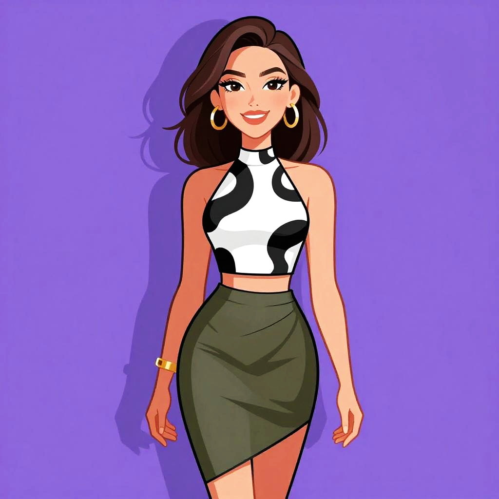 Digital illustration of a stylish woman with short brown hair, wearing a black-and-white cowprint halter top and green leather skirt, against a purple background