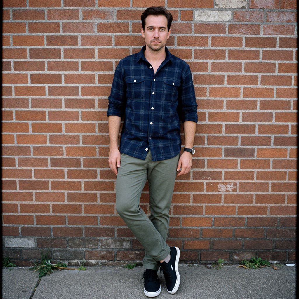 A man, navy blue flannel shirt, tapered olive chinos, black skate shoes, casual vibe, weathered brick walls, AgfaColor film style, relaxed expression. Man has masculine face and piercing eyes