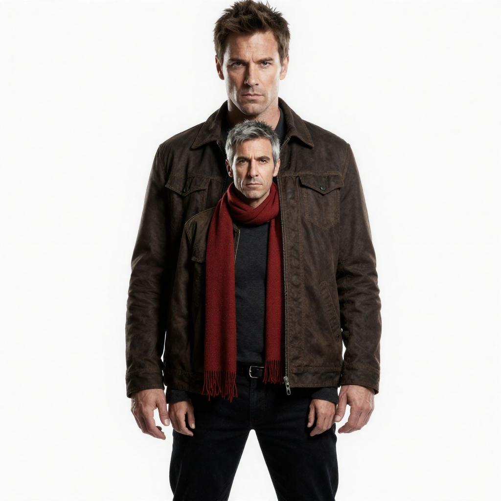 Photograph of two men. Larger man with short brown hair, serious expression, wearing dark brown jacket and black pants. Smaller man with gray hair, serious expression, wearing red scarf, brown jacket, and black pants, partially obscured by black, gray splatter effect. White background. Larger man's right arm extended downward, smaller man's left arm at side.
