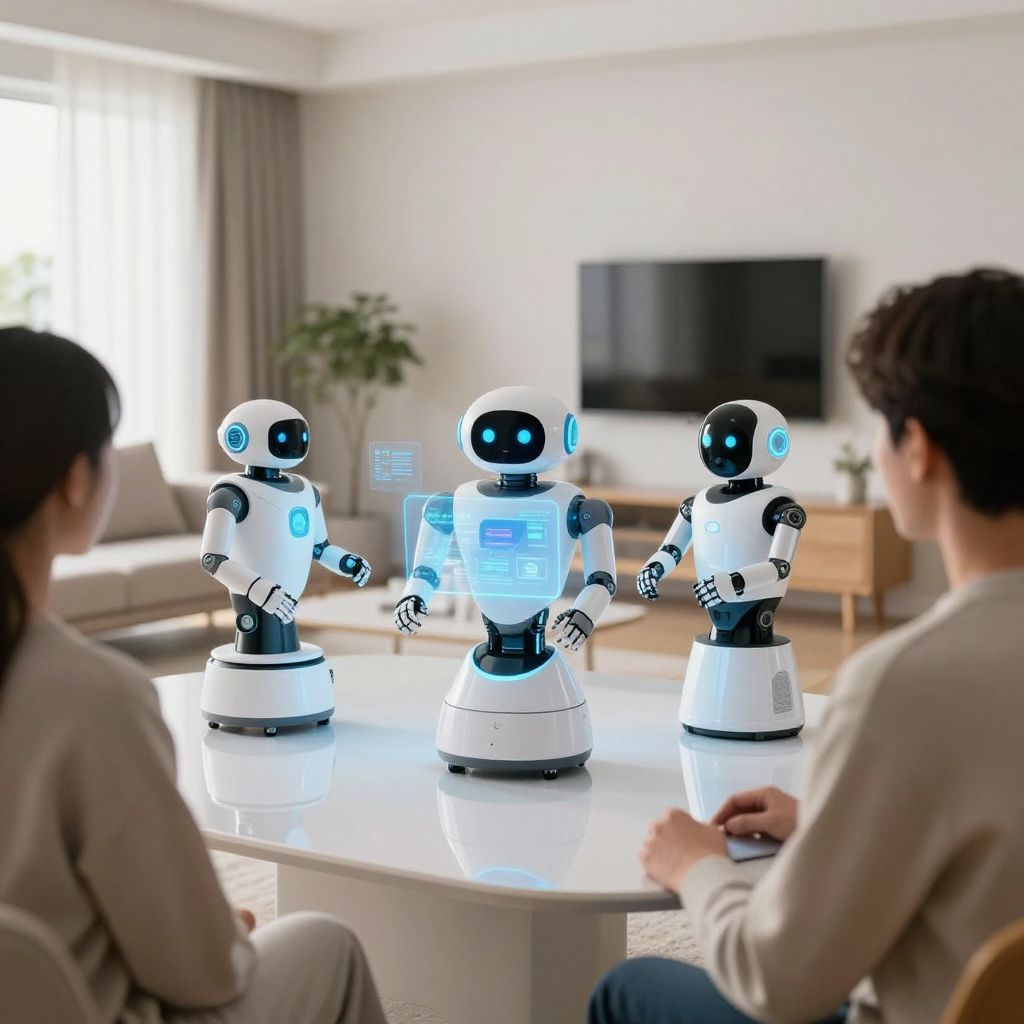 Photograph of a modern, bright living room with three white, humanoid robots with blue glowing eyes and screens on their chests, standing on a white coffee table. A woman with dark hair in a bun and a man with curly hair, both in beige clothing, sit on opposite sides of the table, facing the robots. The background includes a large window with white curtains, a potted plant, and a flat-screen TV on a wooden stand. The room is well-lit with natural light.