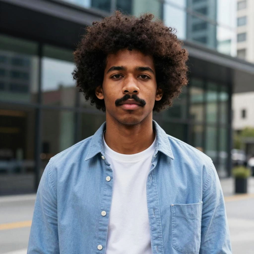Photograph of a young Black man with a large, curly afro and a thick mustache. He's wearing a light blue button-up shirt over a white t-shirt. The background is slightly blurred, showing modern glass buildings and a dark overhang. He's standing outdoors, looking directly at the camera with a neutral expression. The overall vibe is urban and contemporary.