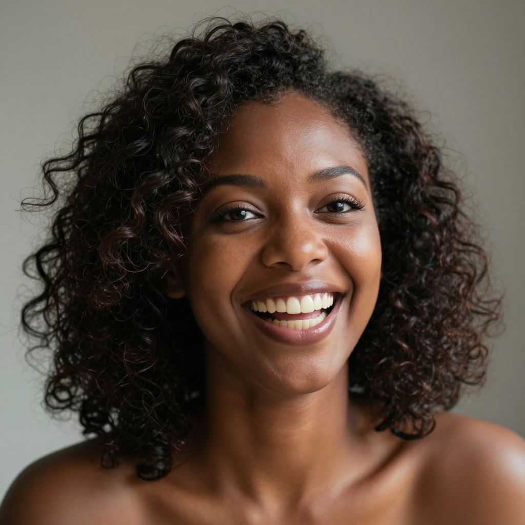Craft a photograph portrait featuring an African American woman with deep brown eyes, full lips, and natural curly hair styled in voluminous coils cascading past her shoulders. She is captured mid-laugh, showcasing genuine joy and warmth radiating from within. The image should depict the interplay of light on her skin—soft highlights accentuating high cheekbones while shadows play across her face, capturing a sense of introspection that invites viewers to share in her happiness. Set against a minimalist backdrop emphasizing simplicity and focus, this portrait aims to evoke an emotional connection between subject and audience.