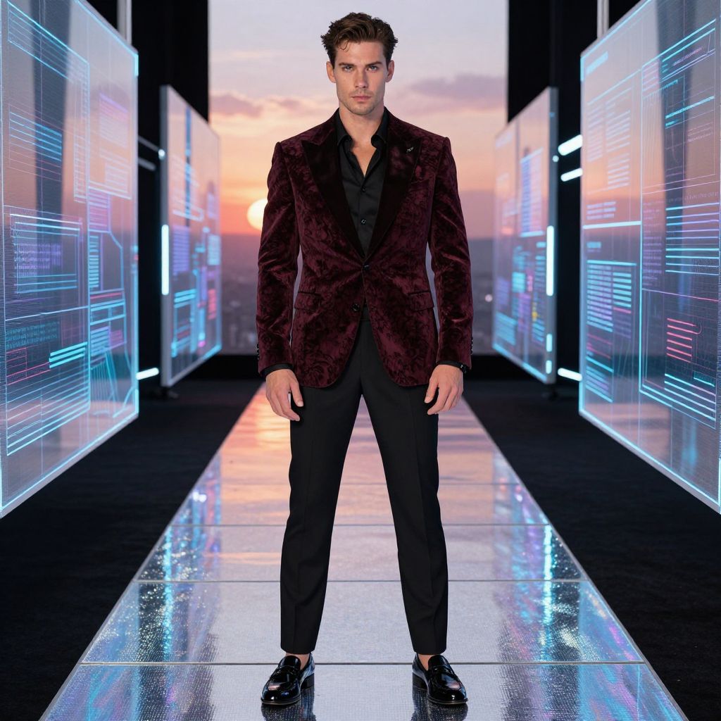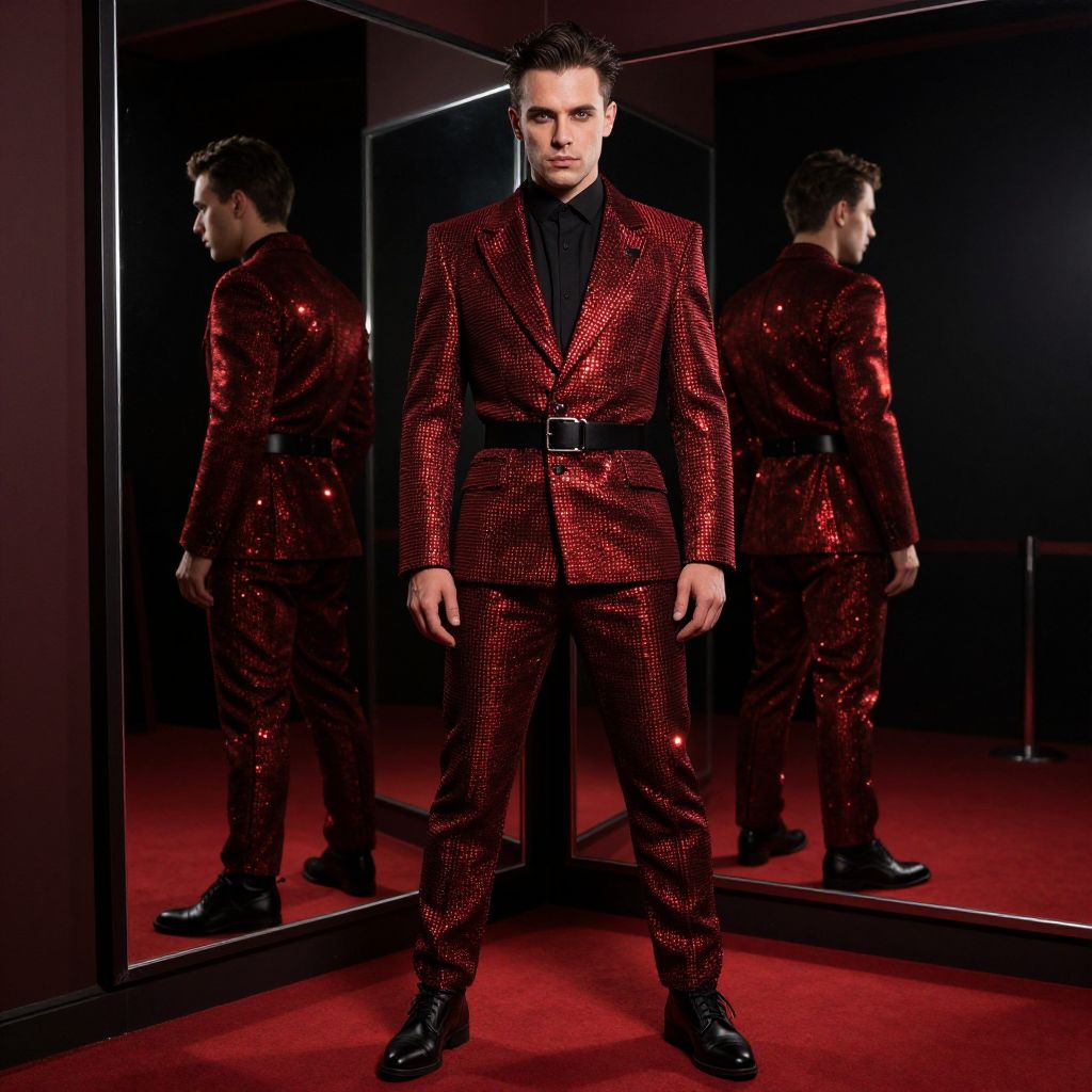 Photograph of a tall, handsome Caucasian man with short, dark hair, standing confidently in a dimly lit room with red carpet and mirrored walls. He wears a striking, shiny red sequin suit with a black shirt and black belt, paired with polished black shoes. His reflection is visible in the mirrors, adding depth. The man's stern expression contrasts with the vibrant, glamorous attire, creating a dramatic, edgy look. The red sequins catch the light, enhancing the suit's sparkle against the dark background. The image emphasizes fashion and confidence.