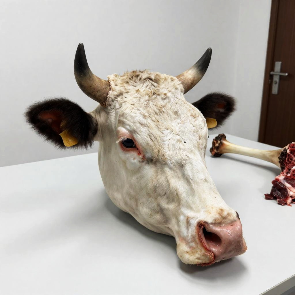 Photograph of a butchered cow's head with large black ears, red and raw flesh, and exposed bone on a white table. Background includes white walls and a door. Another animal bone and meat pieces are on the table.