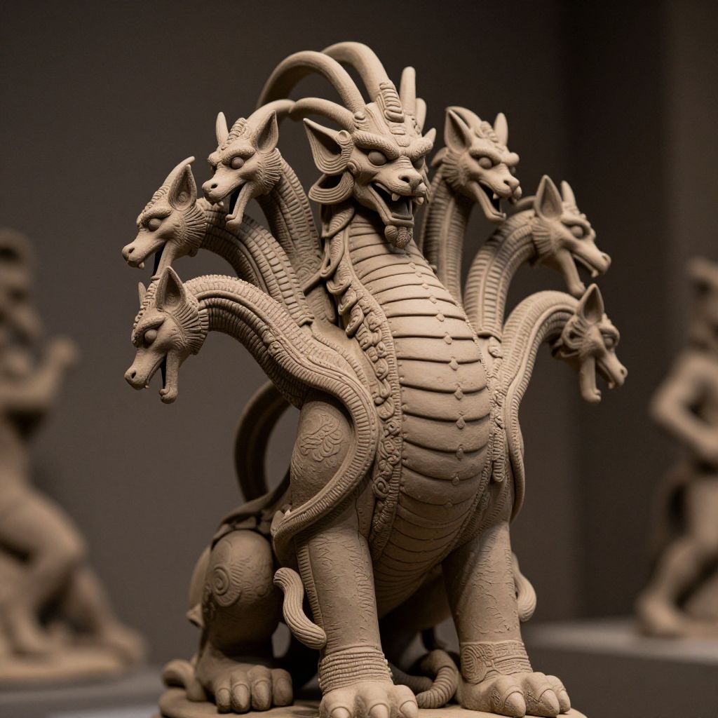 A clay model of a mythological hydra monster with many heads, intricate details, photograph, sharp focus, depth of field, cinematic lighting, inspired by ray harryhausen,