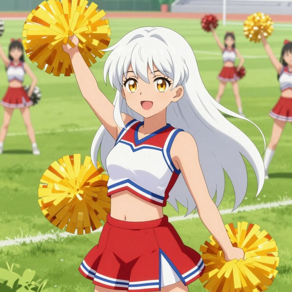Anime-style illustration featuring a cheerleader with long white hair and golden eyes in a red, white, and blue cheerleading outfit holding large yellow pom poms. The background shows a sports field and other cheerleaders performing in the distance.