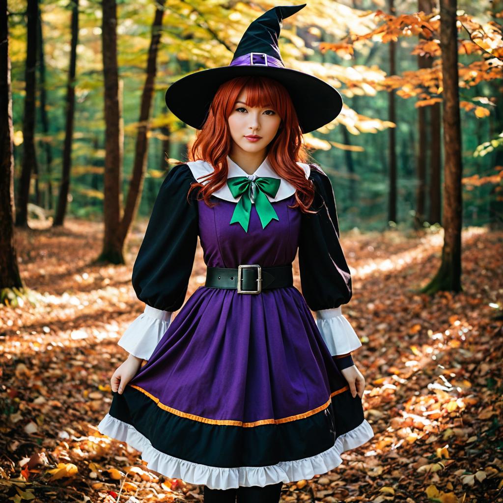 Good witch costume plus size, photorealistic portrait of a plus-sized woman with long red hair, wearing a black witch hat and a black dress with white puffed sleeves, standing in front of a brick building, sunny day, smiling, hand on waist, brick wall background, daylight, casual outdoor setting