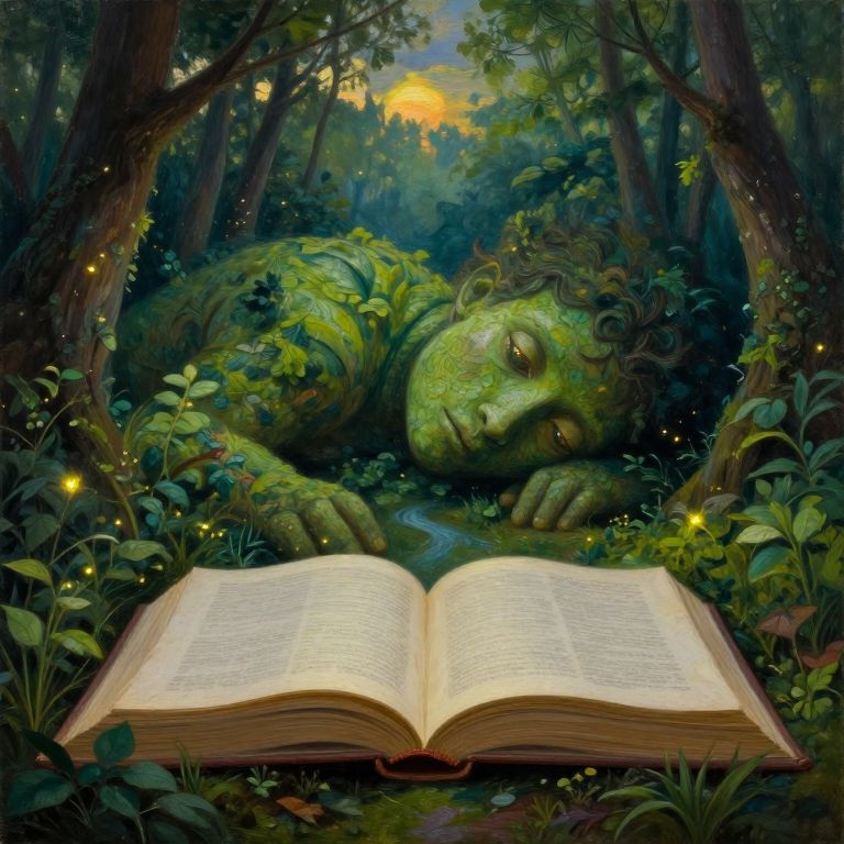 Dive into the captivating world of a surreal oil painting, embodying the dreamlike atmosphere of an overgrown forest at twilight. From your vantage point within the intricate details of an enormous, open book - its pages fluttering softly with the evening breeze - you find yourself surrounded by nature's lush embrace. The vibrant greens of the foliage merge seamlessly into the textured skin of a slumbering giant; his visage resembling the landscape itself, with valleys as creases and rivers flowing like veins. His eyes, reflecting the soft glow of fireflies and setting sun, hold a deep wisdom intertwined with the secrets of nature. This evocative blend of surrealism and natural beauty transports you into an otherworldly realm, where reality and imagination intertwine in a mesmerizing dance of light and shadow.