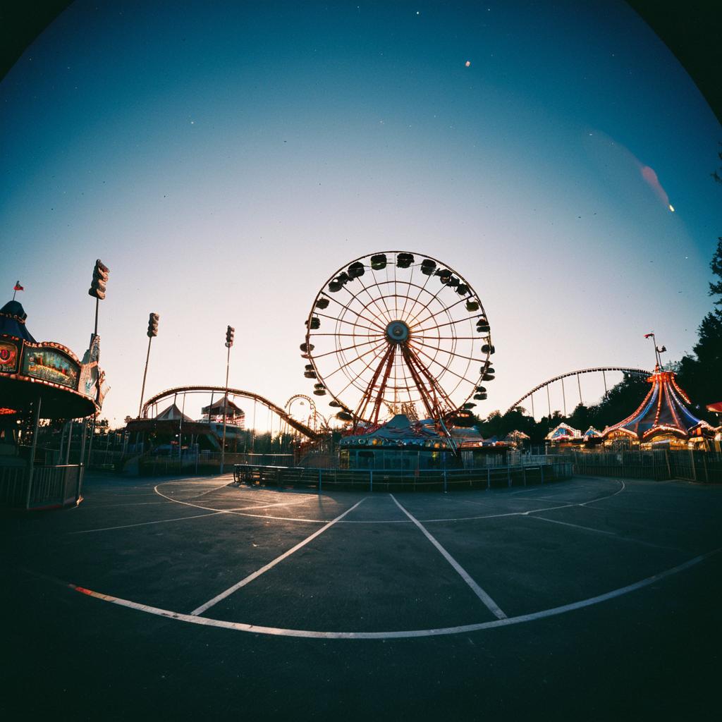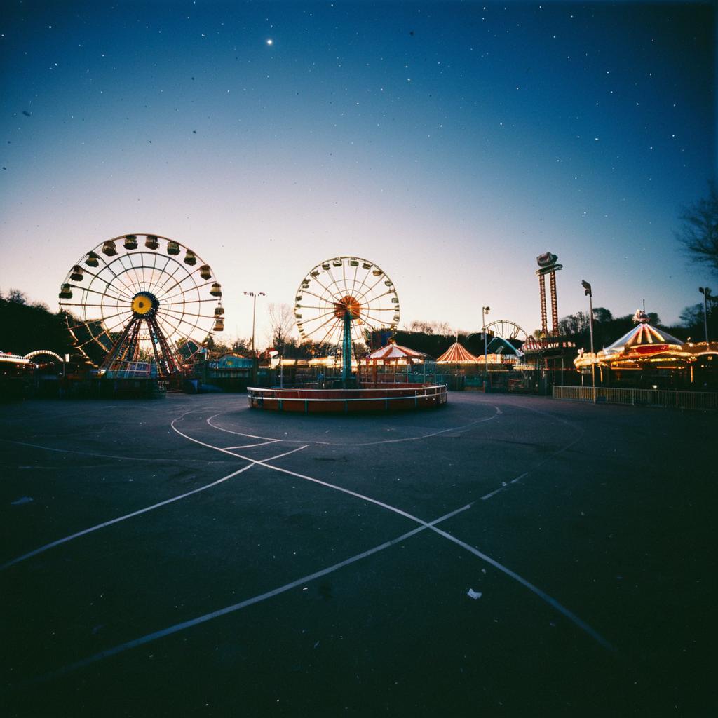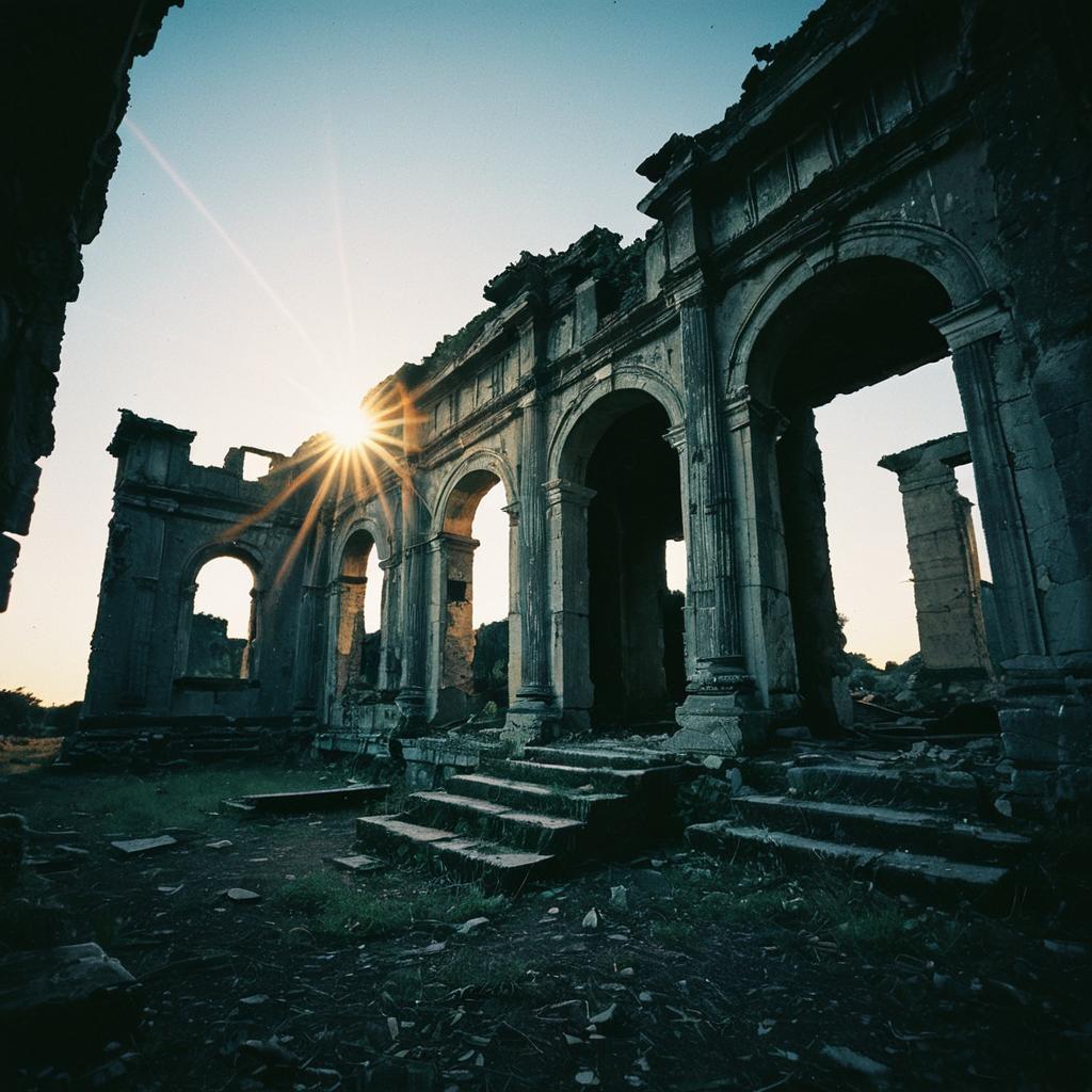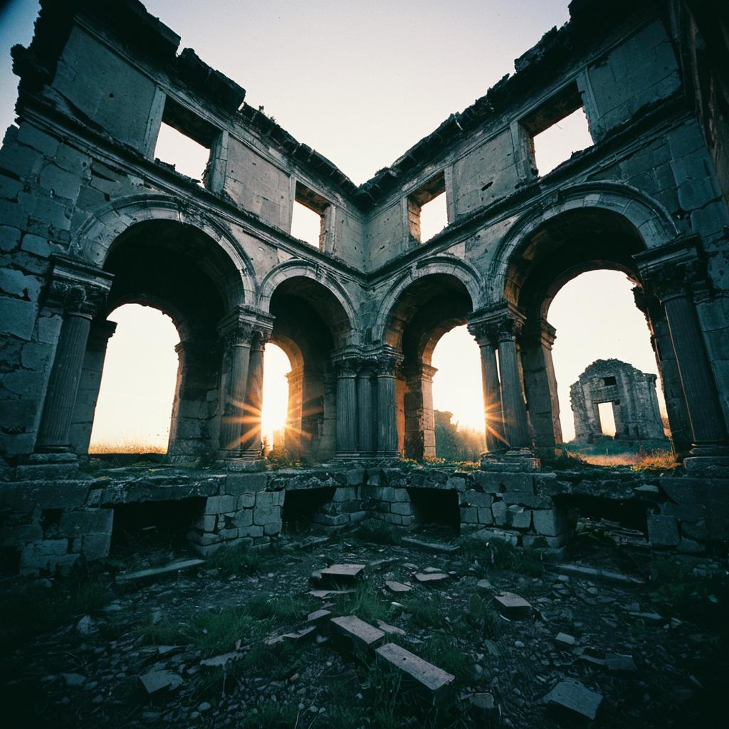 Still photograph of an ancient abandoned ruin at twilight, capturing a sense of decay, mystery. The passive camera shot uses a wide-angle lens and slow shutter speed to emphasize the moment, featuring refracted lens flare and subtle post-processing techniques.