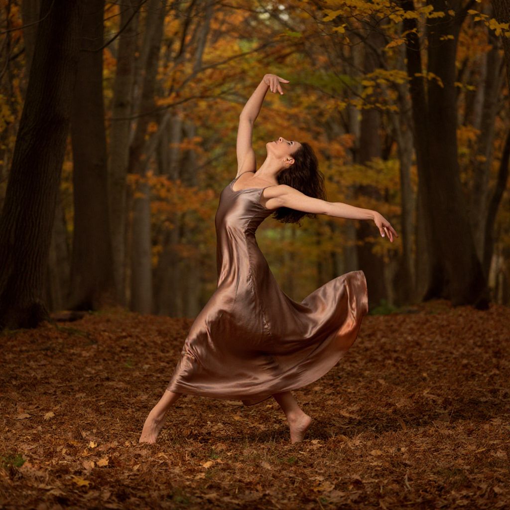 Photograph of a ballet dancer in a flowing, brown satin dress, mid-arch in an autumn forest, leaves and trees in the background.