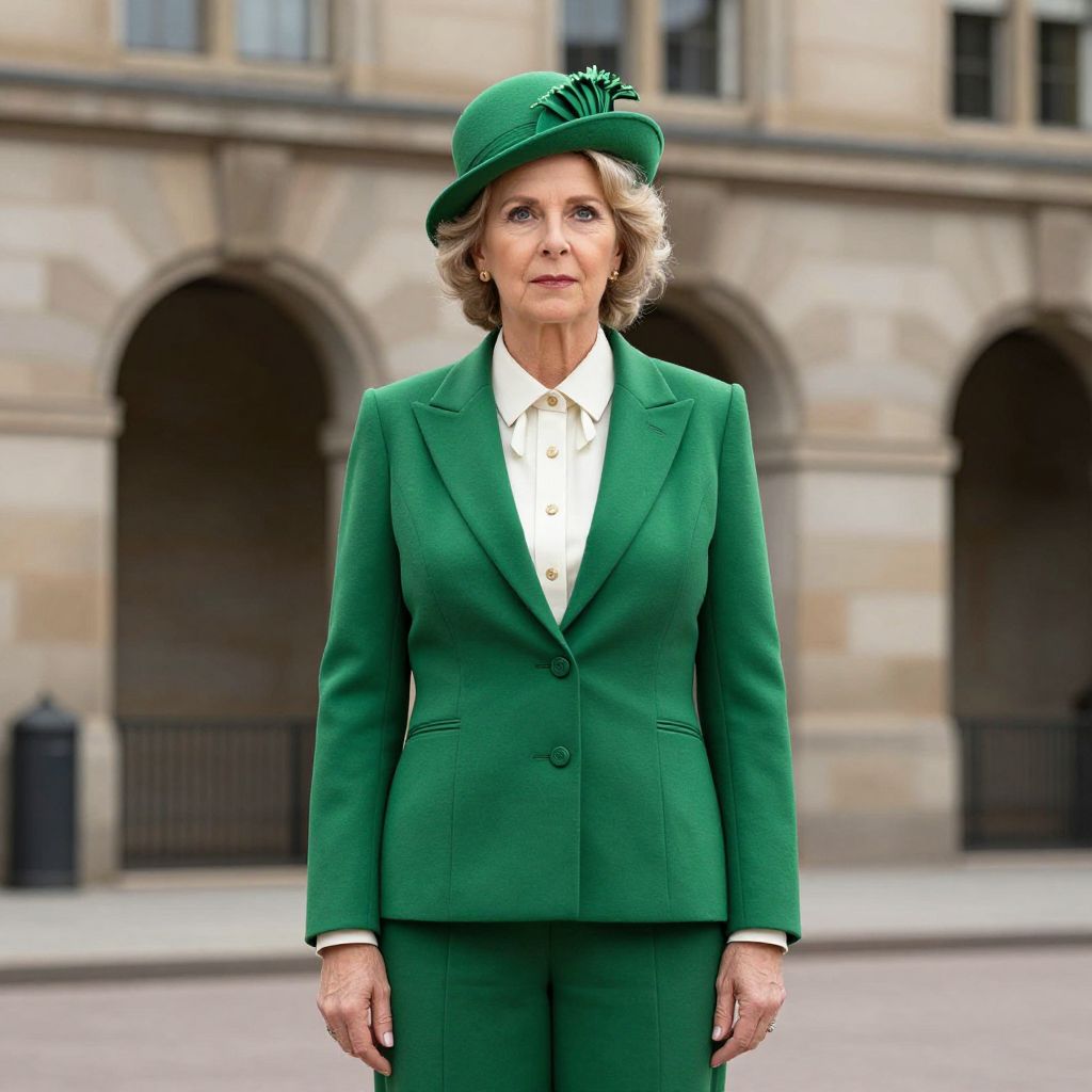 Photograph of an elderly woman standing outdoors in front of a stone building with arched doorways. She has short, wavy blonde hair and is wearing a green tailored suit with a matching green hat featuring a black feather. She also wears a white shirt with a small bow at the collar. Her expression is serious and composed. The background shows beige and gray stone walls with three arched doorways. The image has a realistic, crisp style, emphasizing the woman's formal attire and the architectural details behind her.