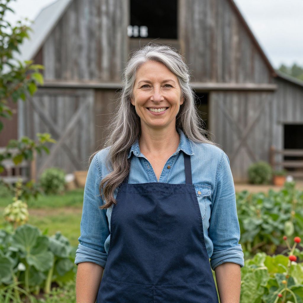Photograph of a smiling Black woman with short curly hair, wearing a blue floral apron over a white shirt, standing in a sunlit, rustic