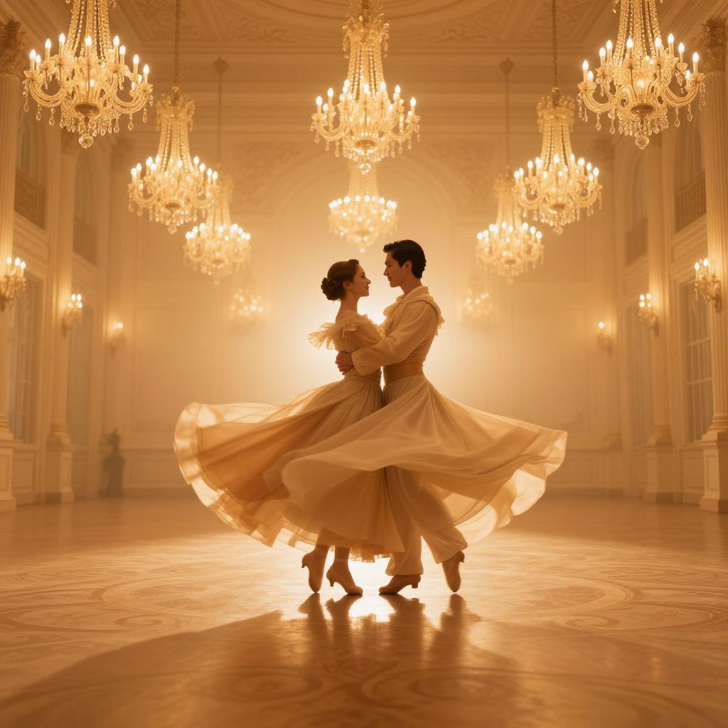 Waltzing couple in an elegant ballroom, dressed in flowing vintage attire, soft golden lighting illuminating the grand chandeliers, graceful movements captured mid-spin with a dreamy, romantic atmosphere, intricate floor reflections enhancing the scene