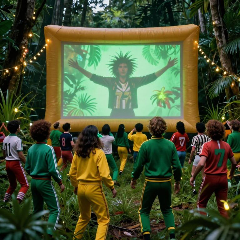 The image captures a surreal and vibrant scene set in the Amazon rainforest during the 1970s. A large inflatable projector screen, glowing with a greenish hue, dominates the background, projecting an intense image of a person with wild hair and outstretched arms. The crowd, dressed in green and yellow tracksuits, is immersed in the spectacle, their faces illuminated by the screen's light. Fairy lights and fireflies add to the otherworldly atmosphere, while lush, wet grass and tall grasses frame the scene. The composition is dynamic, with people in 70s football shirts scattered throughout, creating a sense of movement and energy. The image is rich in detail, with intricate textures and vibrant colors, evoking the style of Wes Anderson, Quentin Tarantino, and David LaChapelle. The overall mood is hedonistic and surreal, with a sense of ritualistic characters in a weird dimension. The scene is captured with a high-resolution, retro-futuristic aesthetic, using a Sony Alpha a7 8k + Hasselblad 800mm lens, and is reminiscent of Kubrick, Jodorowsky, and Verner Panton's work. The composition is masterful, with a high level of detail and a whimsical, concept art + hi-art direction by hedonist mayhem.